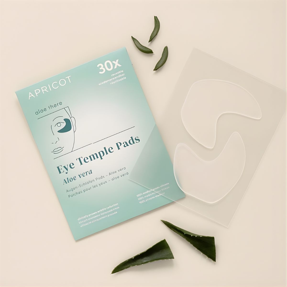 Die Apricot Augenschläfen Pads „Aloe There“ bieten eine gezielte Pflegeoption für die empfindliche Haut rund um Augen und Schläfen. Die wiederverwendbaren Pads bestehen aus reinem medizinischem Silikon und enthalten hochwertigen Bio-Aloe-vera-Saft, der direkt in das Material eingearbeitet ist.