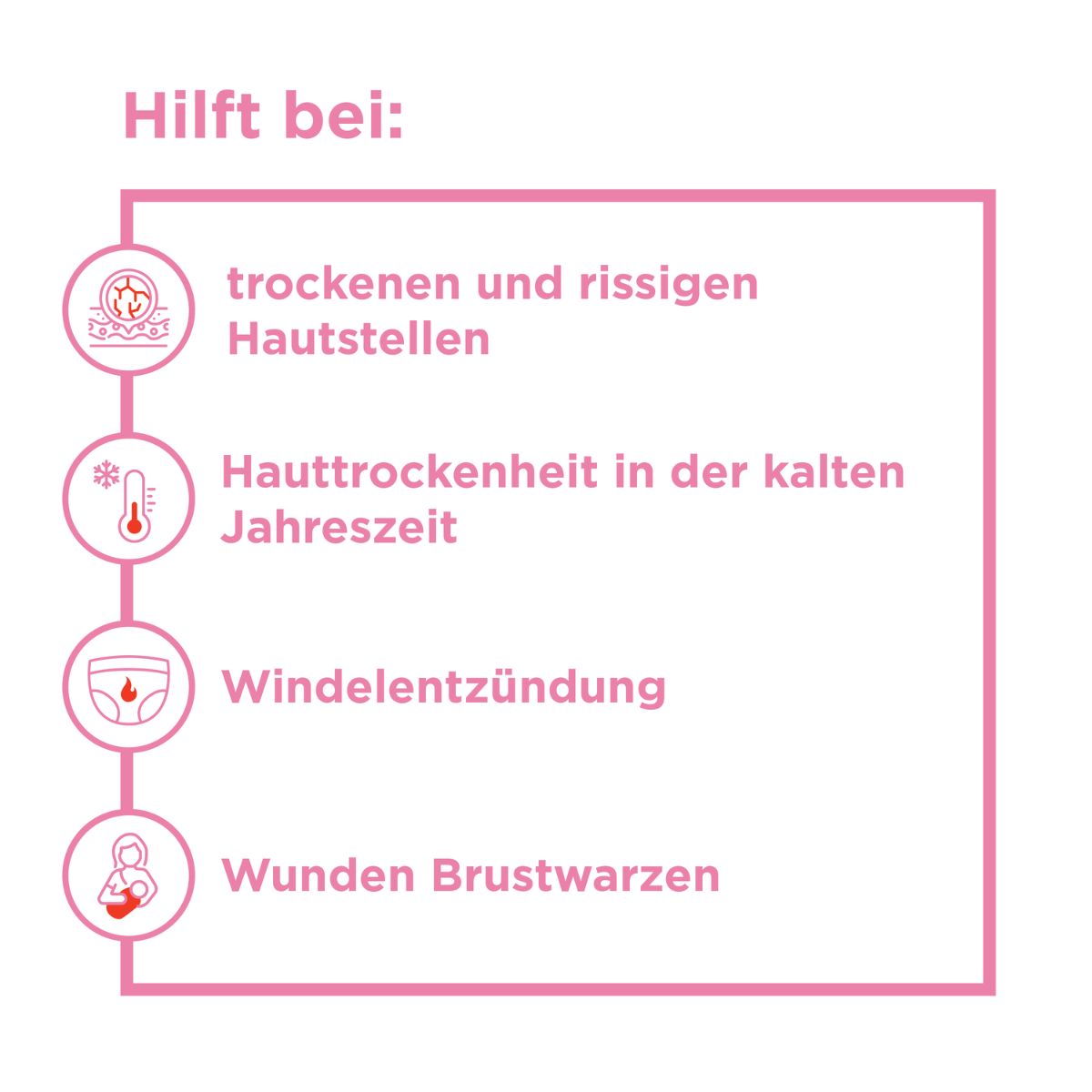 Die Bepanthen® Salbe kann zur Prävention oder Behandlung einer Windeldermatitis angewendet werden: sie unterstützt den natürlichen Wundheilungsprozess dank dem Wirkstoff Dexpanthenol (Provitamin B5). Dadurch wird die wunde und strapazierte Haut im Windelbereich regeneriert. Auch die natürliche, schützende Hautbarriere wird durch die Salbe wiederhergestellt. Darüber hinaus bildet sie einen leichten Schutzfilm gegen schädliche Einflüsse, wie Urin, Stuhl und Reibung.
