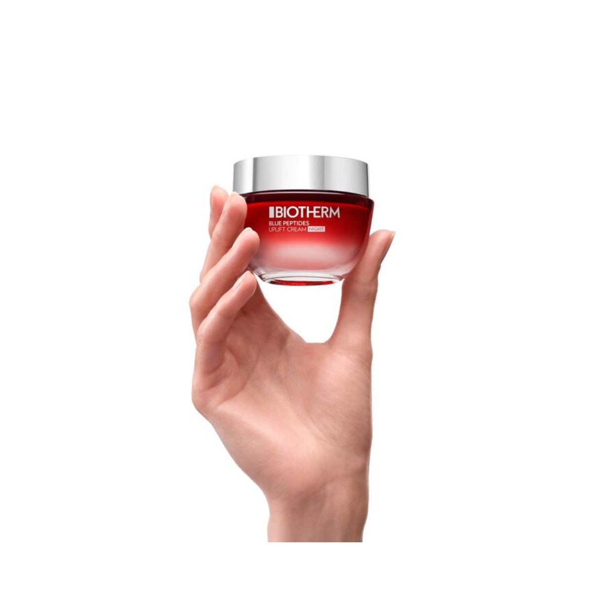 Die Blue Peptides Uplift Night Cream von Biotherm lässt die Haut strahlen und sorgt für ein gesundes Aussehen. Durch die Kombination von Life Plankton und Kollagenpeptiden wird die Haut in ihrer Struktur unterstützt und gestrafft. Die reichhaltige Pflege regeneriert die Haut über Nacht.