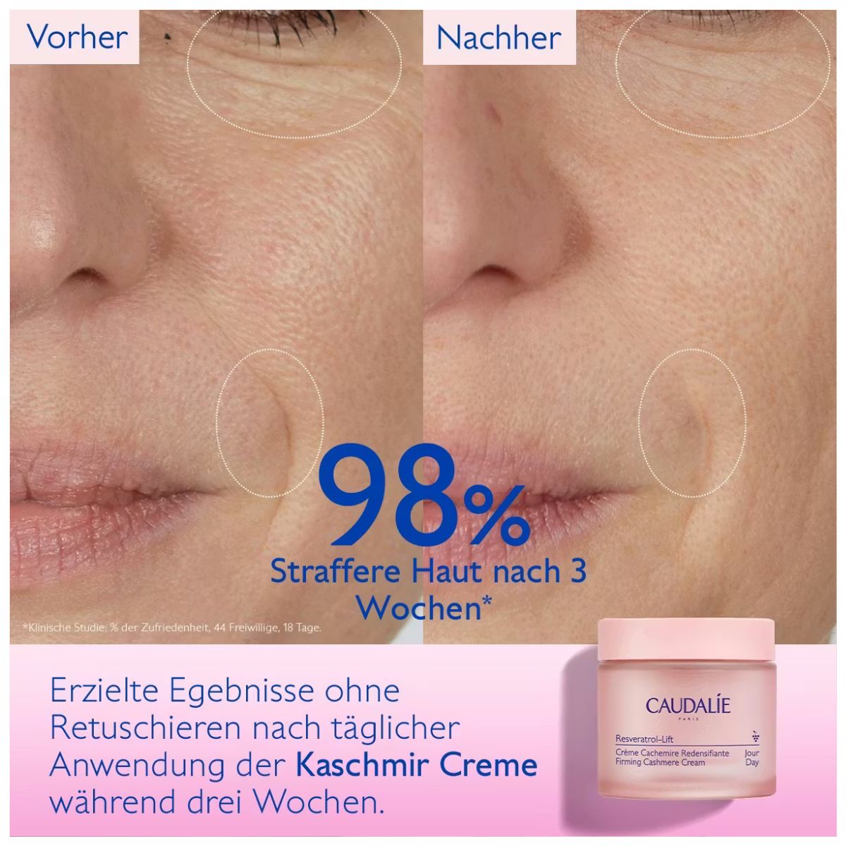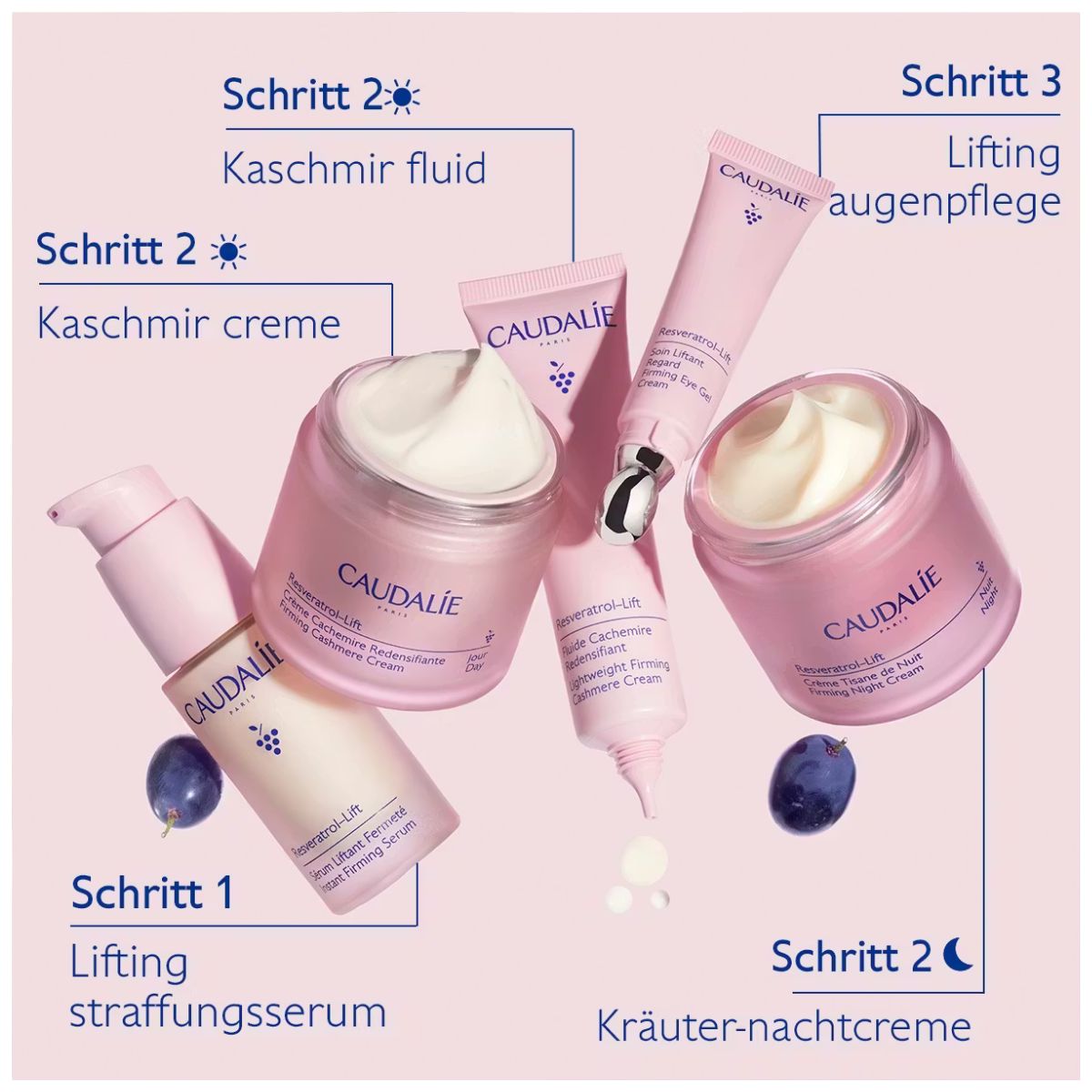 Kombiniere die Kaschmircreme mit dem Resveratrol‑Lift Serum oder der Augencreme aus derselben Serie für ein komplettes Anti‑Aging‑Ritual.