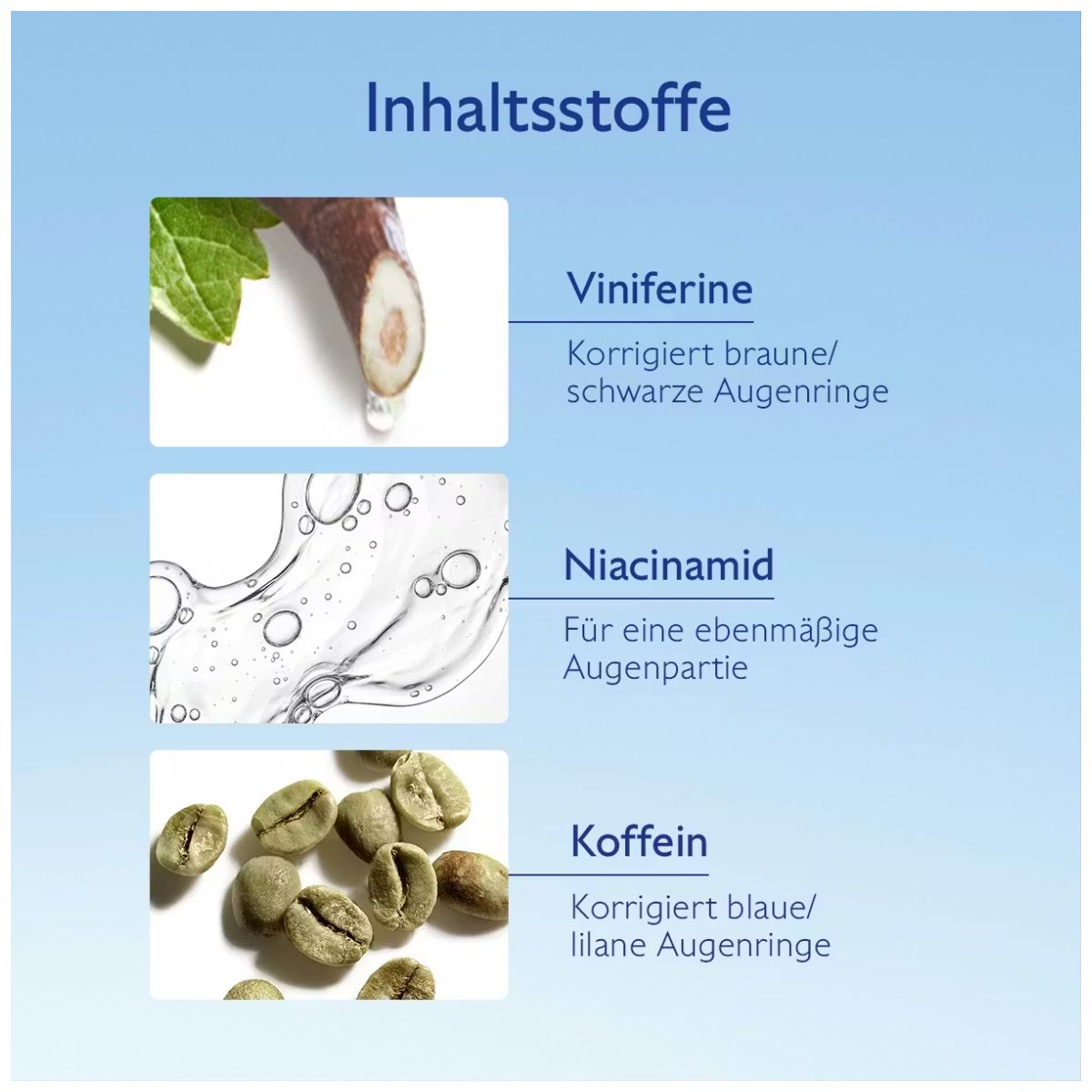 Die Formel kombiniert drei leistungsstarke Wirkstoffe: Viniferine, Koffein und Niacinamid. Diese wirken synergetisch, um die Haut aufzuhellen, die Mikrozirkulation zu unterstützen und Schwellungen sowie dunkle Verfärbungen zu mildern.