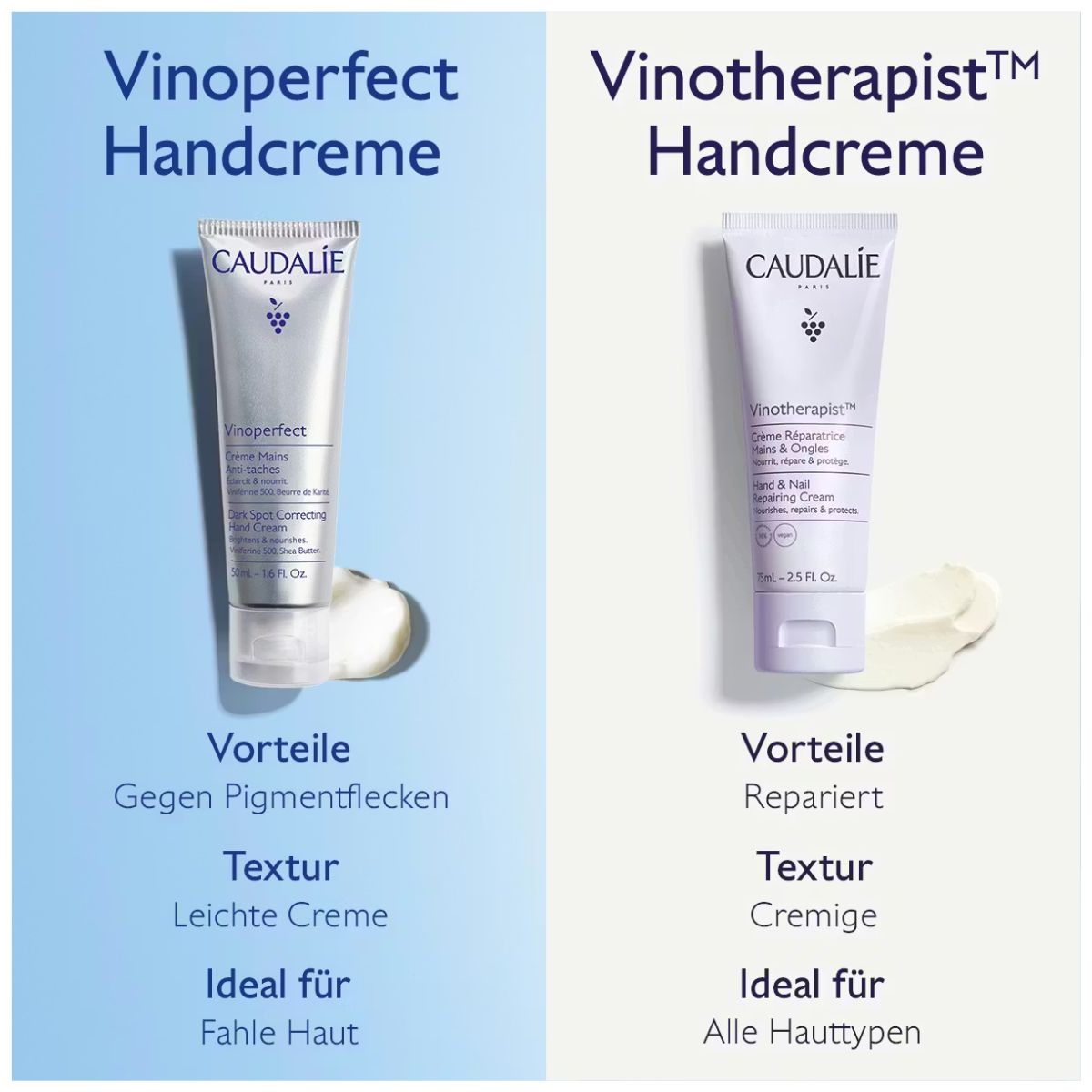 Die Caudalie Vinoperfect Handcreme gegen Pigmentstörungen ist eine gezielte Anti-Pigmentflecken Pflege für die Hände, die sichtbare braune Flecken mildert und gleichzeitig der Neubildung von Verfärbungen vorbeugt. Die Haut der Hände wirkt dadurch gleichmässiger, gepflegter und strahlender.