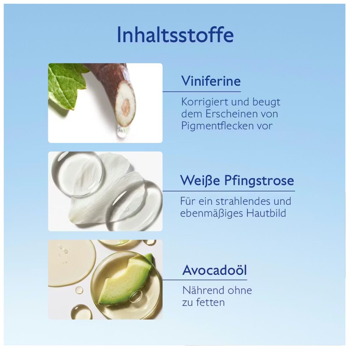 Die Formel ist angereichert mit dem patentierten Wirkstoff Viniferine aus Weinreben, der für seine besonders hohe Wirksamkeit gegen Pigmentflecken bekannt ist, sowie mit Sheabutter und Avocadoöl, die die Haut intensiv nähren und vor Austrocknung schützen.