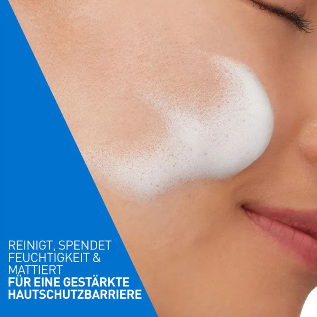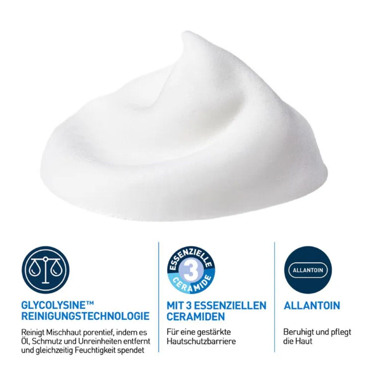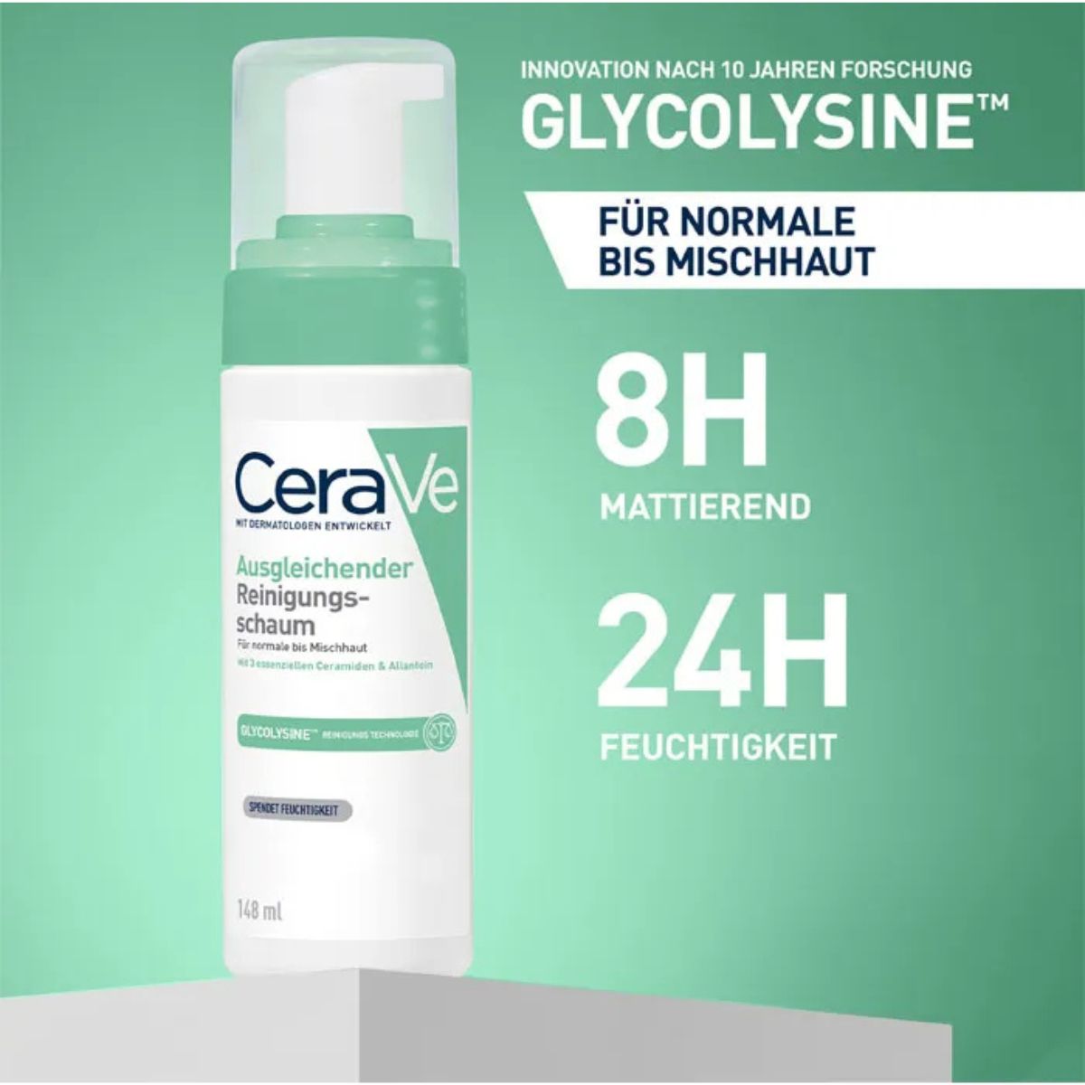 Der CeraVe Ausgleichende Reinigungsschaum für das Gesicht reinigt die Haut porentief, indem er überschüssigen Talg, Schmutz und Unreinheiten entfernt und dank der Glycolysine-Reinigungstechnologie von CeraVe gleichzeitig Feuchtigkeit spendet.
