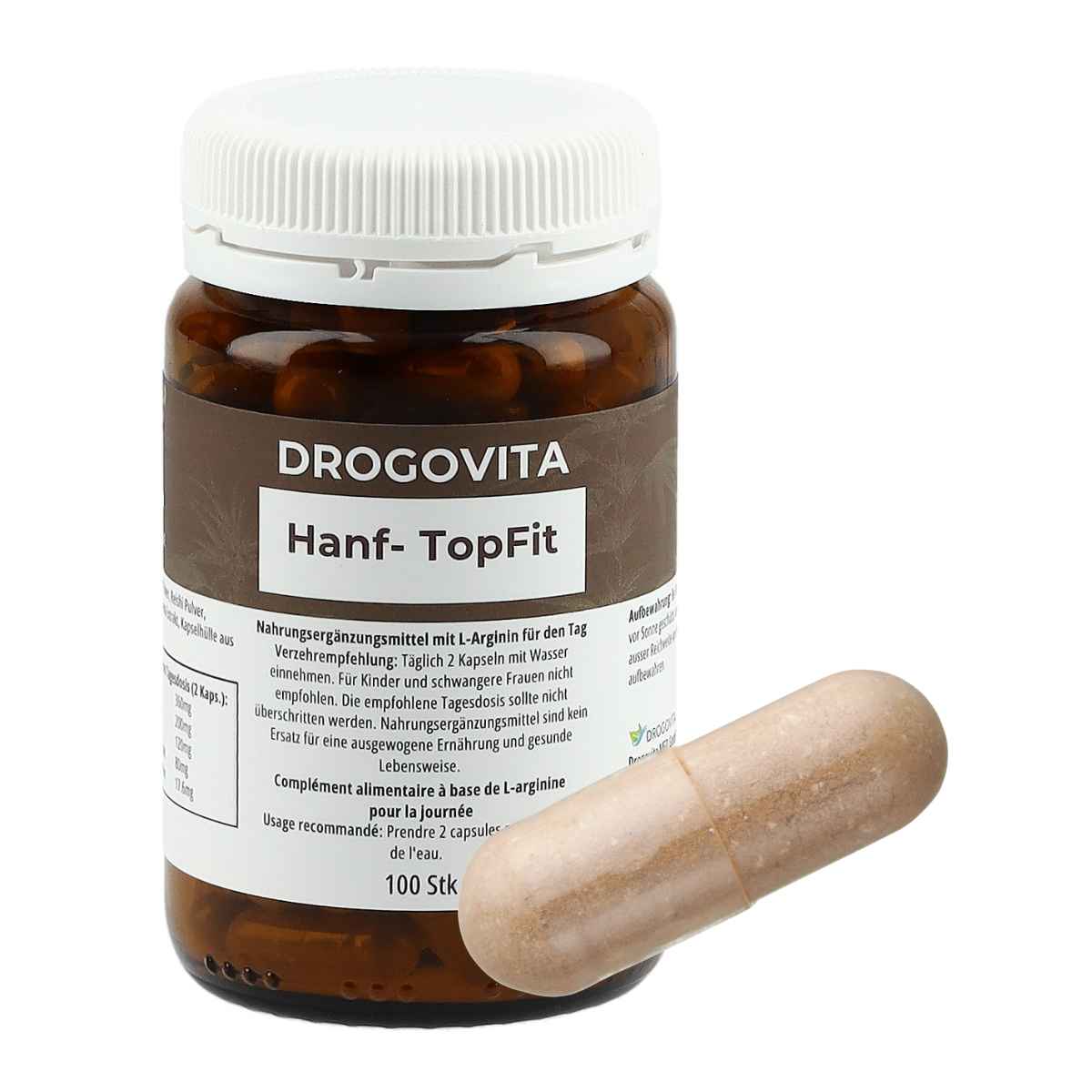 Drogovita Hanf TopFit Kapseln vereinen Hanfextrakt mit L-Arginin zur Unterstützung von Leistungsfähigkeit, Durchblutung und allgemeinem Wohlbefinden.