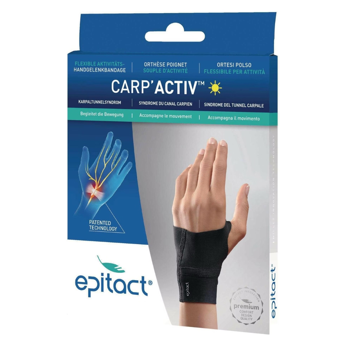Mit carp’activ® hat EPITACT® eine alltagstaugliche Orthese entwickelt, die das Handgelenk bei Ihren täglichen Aktivitäten unterstützt. Ideal, wenn Sie am Karpaltunnelsyndrom leiden.- Ultradünn- Maschinenwäsche bei 30 °C- kombinierbar mit der steifen Nachtorthese- Extrem leicht- als Einzelstück verkauft- erhältlich für die linke bzw. rechte Hand zur Auswahl Durch die Begrenzung des Bewegungsradius des Handgelenks sowie von gefährlichen Fehlstellungen der Hand, die das Karpaltunnelsyndrom begünstigen, trägt die Handgelenkbandage CARP’activ® dazu bei, dass Sie Ihren Alltagsaktivitäten wieder ohne Bedenken nachgehen können. Die weiche, dünne und diskrete Orthese wurde dazu entwickelt, die Bewegungen Ihres Handgelenks zu begleiten und Ihre Finger gleichzeitig beweglich zu halten.Grössen (Handgelenkumfang):S 17-19cm M 19-21.5cm L 21.5 - 24cm