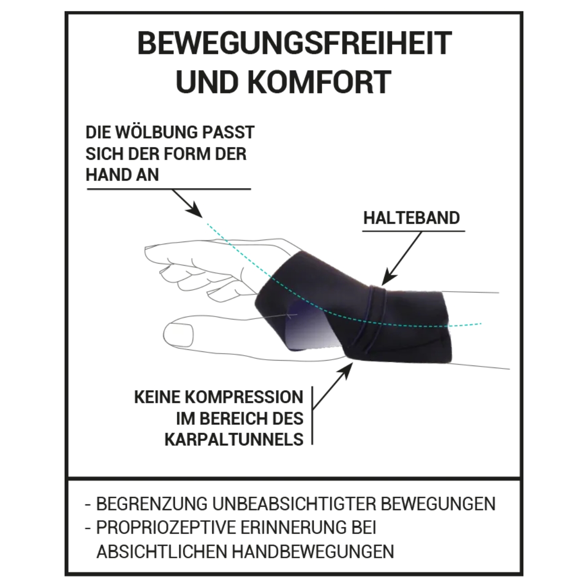 Nachts sowie in allen Situationen, in denen Sie Ihre Hand nicht benutzen, wird das regelmässige Tragen der CARP’IMMO-Ruheorthese bei Karpaltunnelsyndrom, Erkrankungen des Bewegungsapparats, Entzündungen oder Sehnenscheidenentzündungen am Handgelenk empfohlen. - Ultradünn- Von Hand waschbar - kombinierbar mit der Tagesorthese - Extrem leicht- als Einzelstück verkauft- erhältlich für die linke bzw. rechte Hand zur Auswahl Entgegen einer gängigen Meinung ruht das Handgelenk in der Nacht nicht, es wird vielmehr dazu verwendet, das Kissen zurechtzurücken, sich im Bett umzudrehen etc. Dies erhöht den Druck im Karpaltunnel und verursacht Schmerzen. CARP' IMMO® hält das Handgelenk in einer neutralen Stellung, um ruhige Nächte und einen erholsamen Schlaf zu ermöglichen. Grössen (Handgelenkumfang):S 17-19cm M 19-21.5cm L 21.5 - 24cm