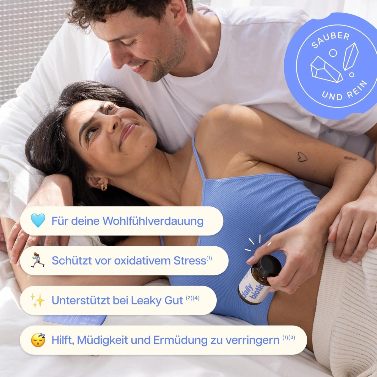 daily biotic enthält 20 aktive Bakterienstämme, perfekt an den menschlichen Darm angepasst. Mit einem B-Vitamin-Wirkstoffkomplex und hochwertigen Ballaststoffen für gesteigerte Effektivität und Resilienz.