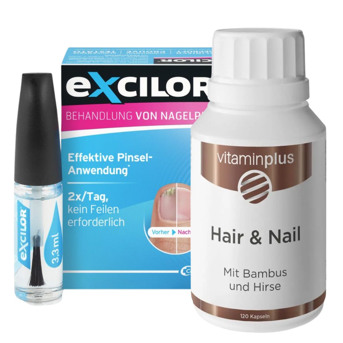 Das Excilor® Lösung und Vitaminplus Hair & Nail Kapseln Set bietet eine ganzheitliche Pflegekombination für alle, die unter brüchigen, verfärbten oder geschädigten Nägeln leiden. Ideal bei Nagelpilz, spröden Nägeln, Haarausfall, Nährstoffmangel und zur allgemeinen Stärkung von Haaren und Nägeln.