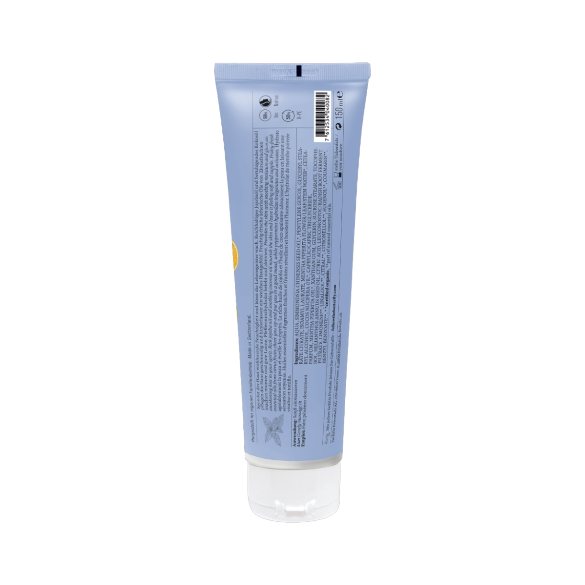 Spendet der Haut wohltuende Feuchtigkeit und küsst die Lebensgeister wach. Reichhaltiges Jojobaöl und beruhigendes Kokosöl pflegen die Haut geschmeidig und hinterlassen ein weiches Hautgefühl. Fruchtig-frische ätherische Zitrusöle machen munter und gute Laune, Pfefferminzhydrolat belebt und aktiviert. Mit Bio-Minze aus dem eigenen Anbauprojekt in Uster/ZH im unmittelbaren Umfeld vom farfalla-Hauptsitz destilliert.