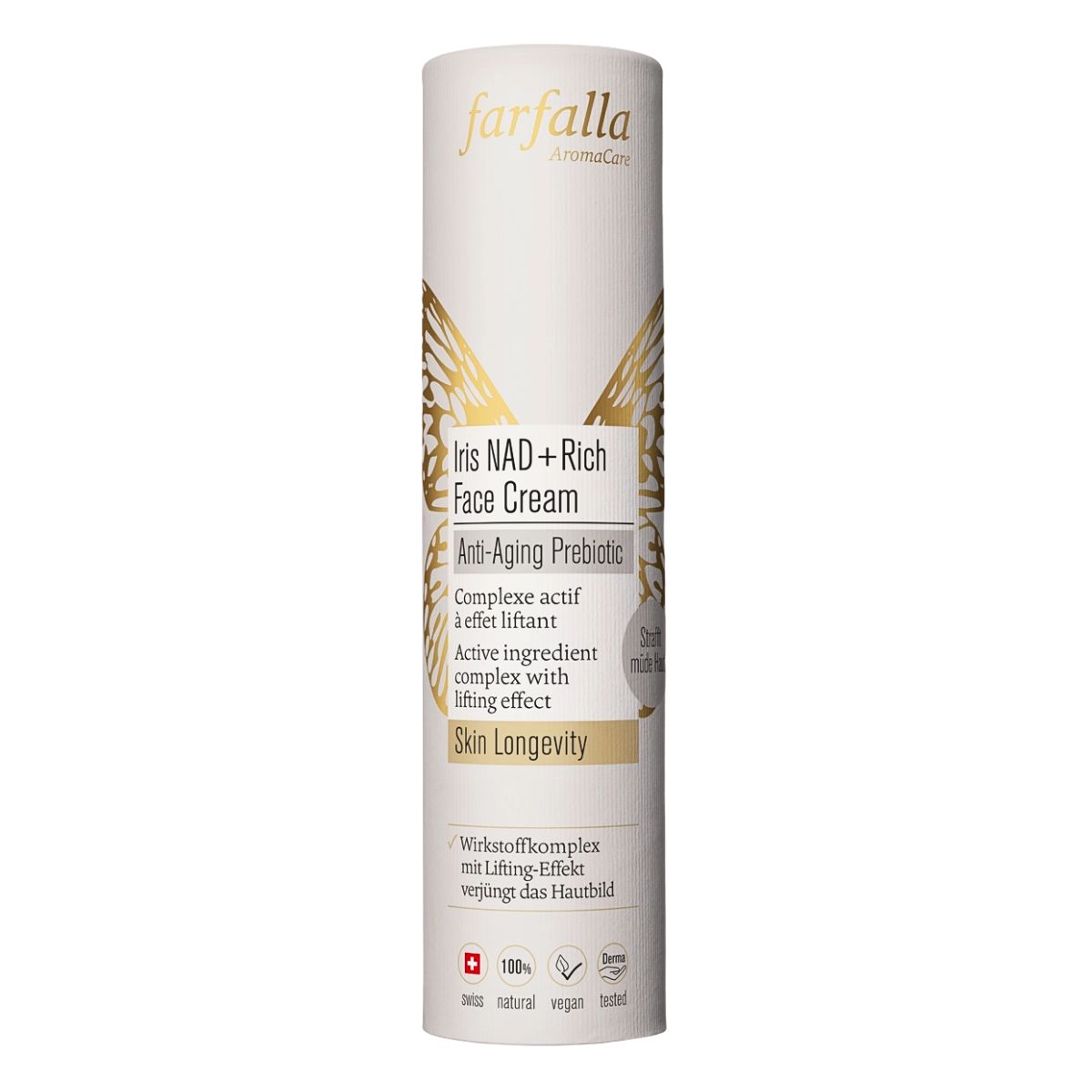 Die Farfalla NAD+ Rich Face Creme Iris ist eine hochwirksame Anti-Aging Gesichtscreme, die speziell für die Bedürfnisse reifer und anspruchsvoller Haut entwickelt wurde. Sie kombiniert moderne Wirkstofftechnologie mit wertvollen pflanzlichen Inhaltsstoffen für ein sichtbar verjüngtes und revitalisiertes Hautbild.