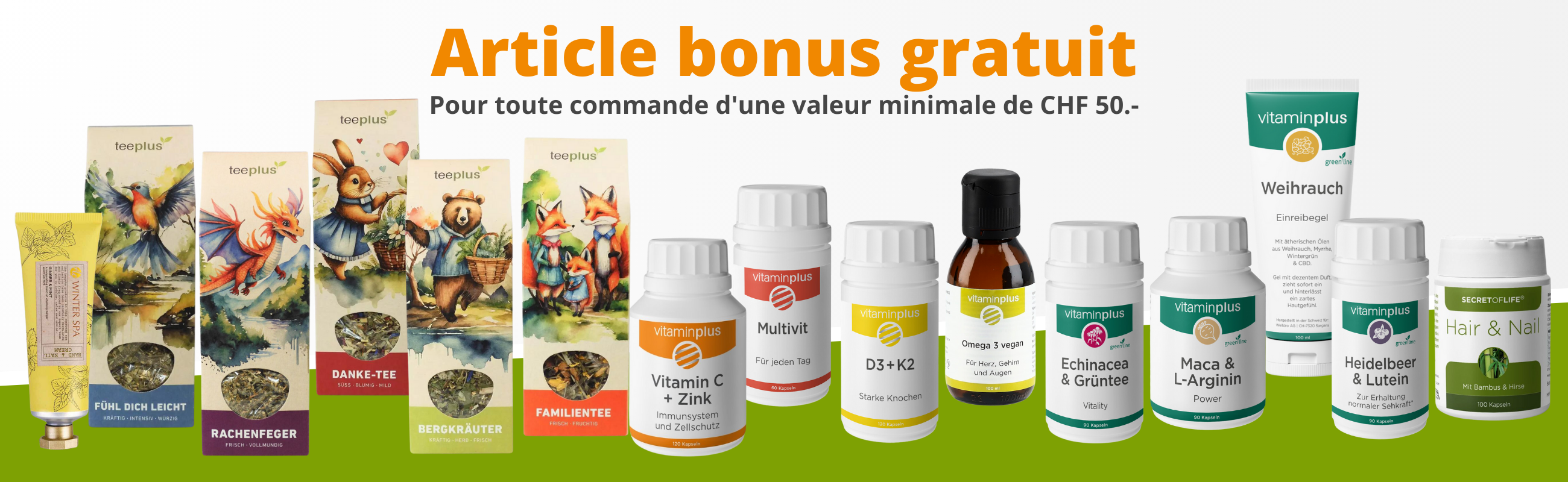 Chez Vitaminplus, tu trouveras des préparations de haute qualité qui aident ton corps à fonctionner sainement. En effet, seul un apport suffisant en vitamines, minéraux et oligo-éléments permet de renforcer le corps, le système immunitaire et les processus métaboliques. Qu'il s'agisse d'affronter un rhume, de passer une journée de travail en pleine forme ou de faire du sport sans douleur, un système immunitaire renforcé ainsi que des muscles et des nerfs sains facilitent grandement notre quotidien. Vitaminplus te propose une gamme complète de nutriments et de compléments alimentaires de qualité pour ta santé. Tu peux facilement commander en ligne chez Vitaminplus des vitamines, des minéraux, des substances actives issues de fruits et de plantes et bien plus encore.