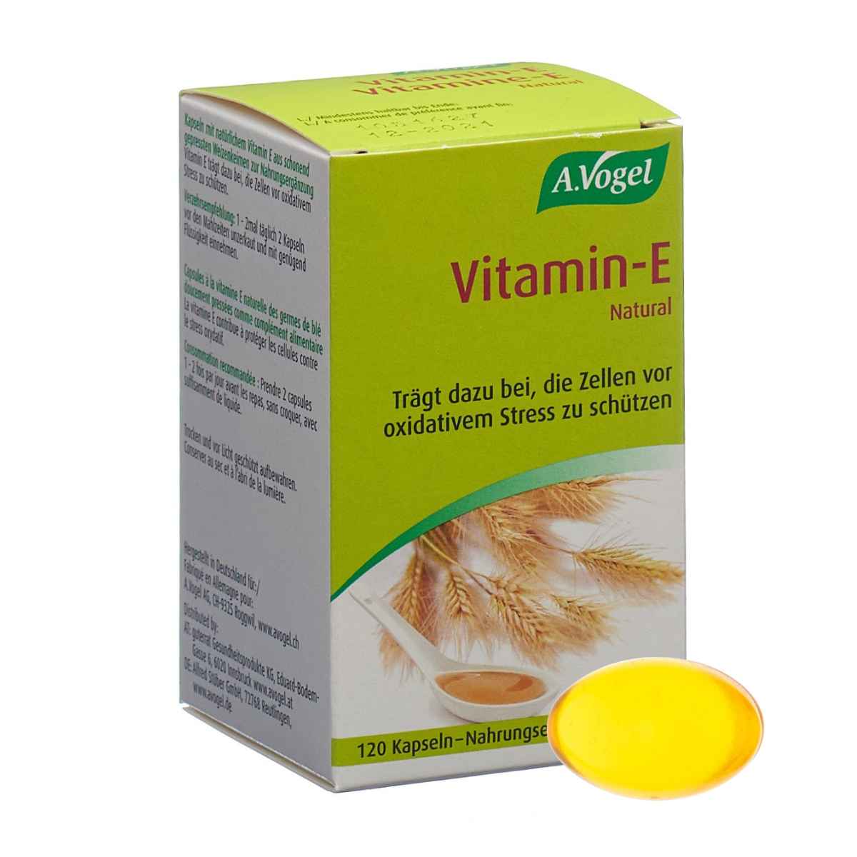 Capsules de vitamine E A.Vogel avec de la vitamine E naturelle issue de germes de blé pressés à froid pour compléter l'alimentation.