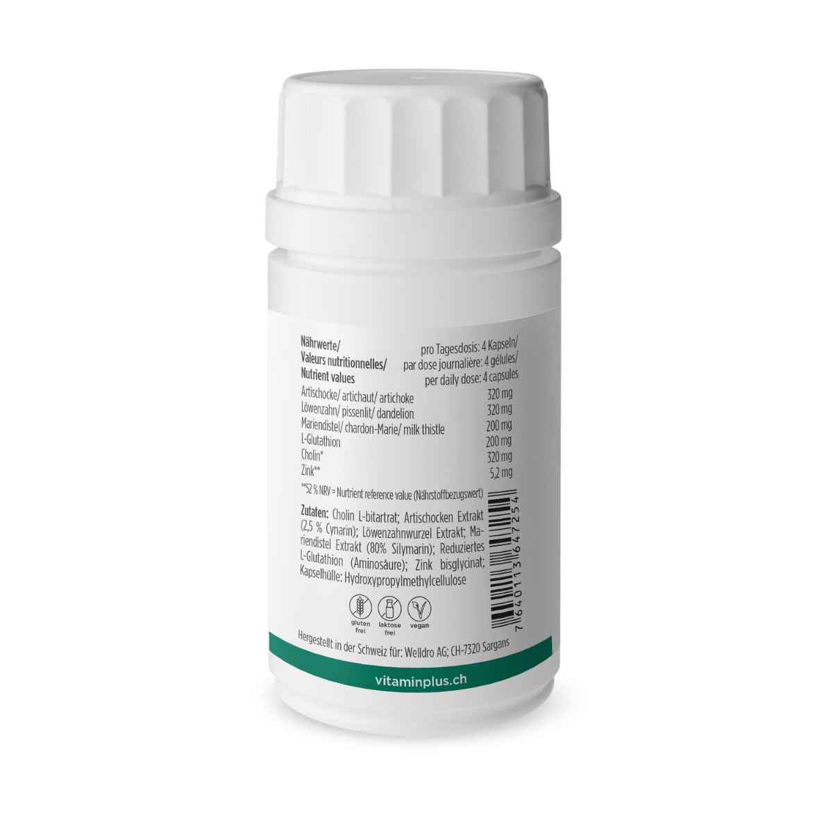 Cholin L-bitartrat; Artischocken Extrakt (2,5 % Cynarin); Löwenzahnwurzel Extrakt; Cellulose; Mariendistel Extrakt (80% Silymarin); Reduziertes L-Glutathion (Aminosäure); Zink bisglycinat; Kapselhülle: Hydroxypropylmethylcellulose