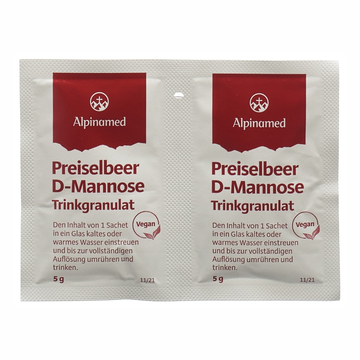 Contrairement aux produits classiques à base de D-mannose, les granulés buvables de D-mannose d'airelle rouge Alpinamed contiennent, en plus du D-mannose, un extrait spécial d'airelle rouge européenne fraîche, ainsi que de la vitamine C et du magnésium.