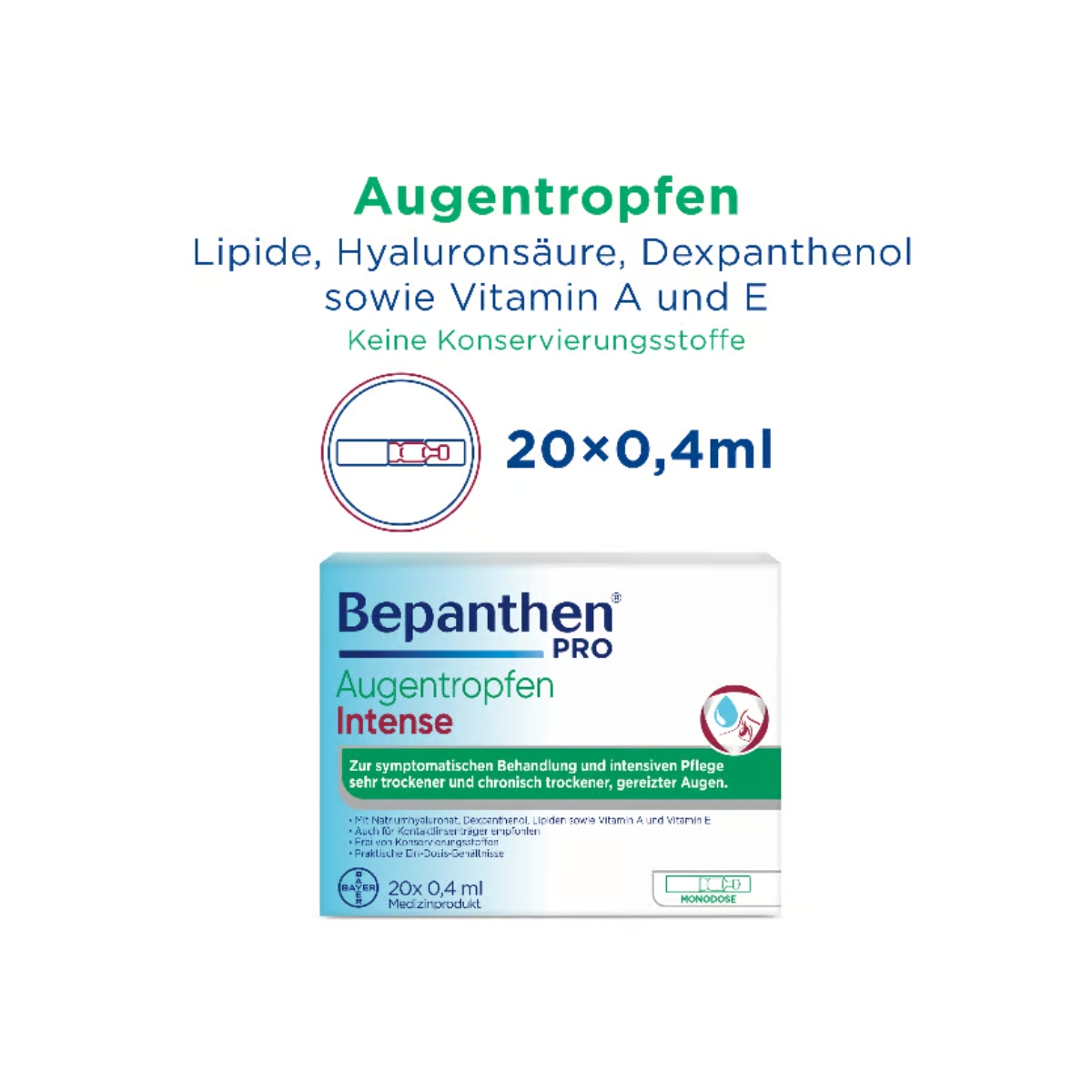 En plus des ingrédients hydratants que sont le dexpanthénol et l'acide hyaluronique, le Collyre Bepanthen®PRO Intense contient des lipides pour la régénération de la couche lipidique naturelle du liquide lacrymal ainsi que de la vitamine A et de la vitamine E comme protection antioxydante de la surface oculaire. L'hydratation, la protection et le soin permettent de soulager efficacement les troubles.