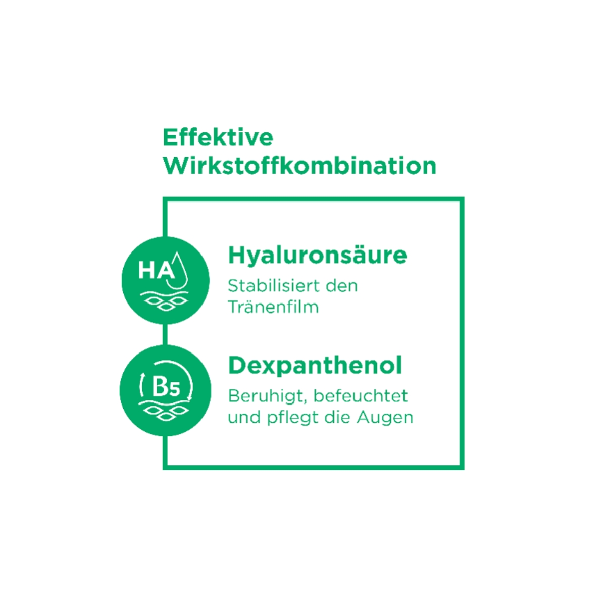 Hyaluronsäure ist eine körpereigene, stark wasserbindende Substanz, die in Augen, Gelenken und in der Haut vorkommt, wo sie für Lubrikation (Gleitfähigkeit) sorgt. Dank ihrer zähflüssigen Konsistenz bleibt die Hyaluronsäure lange am Auge haften und kann so den Tränenfilm ersetzen bzw. stabilisieren. Die trockenen Augen werden mit Feuchtigkeit versorgt.