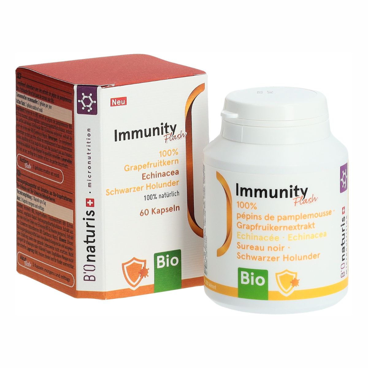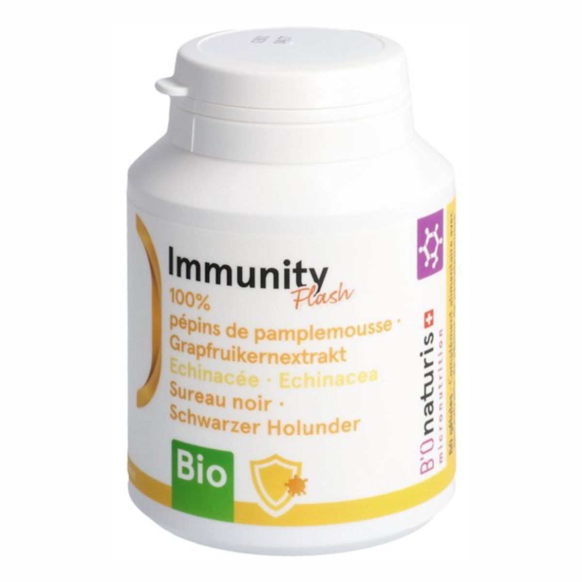 - Description Formule bio avec des extraits de pépins de pamplemousse, d'échinacée & de baies de sureauImmunity Flash BIO est un c… Plus