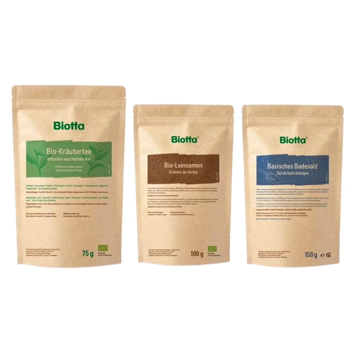 Semaine de bien-être Biotta - des jus de fruits et de légumes naturels pour une cure de jus. Inclus un paquet de tisane bio et des graines de lin bio.