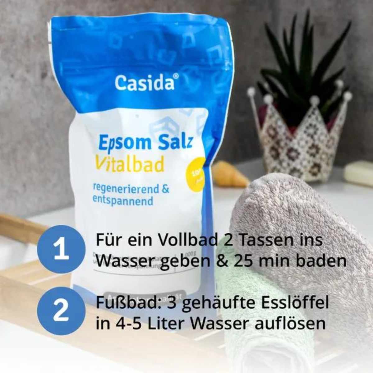 Le bain vital au sel d'Epsom contient 1000 g de sel d'Epsom pur dans un sachet à fond plat refermable très pratique. Le sel d'Epsom est un minéral naturel riche en magnésium qui a été découvert pour la première fois dans les mines de sel d'Epsom, en Angleterre. C'est de là que vient le nom anglais "Epsom Salt".