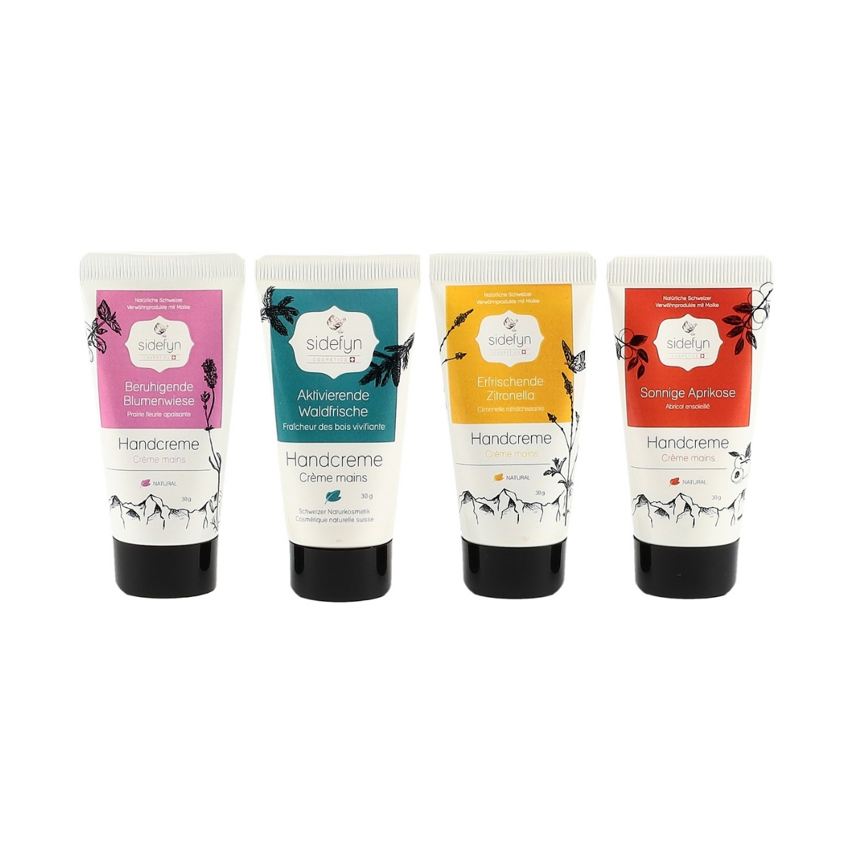 Le coffret cadeau Sidefyn Rêve de mains est le cadeau idéal. Les quatre parfums enchanteurs garantissent des mains merveilleusement soignées. Le coffret contient 1 crème pour les mains Sidefyn Activante Fraîcheur des Bois, Lavande Harmonieuse, Citronnelle Rafraîchissante et Abricot Ensoleillé de 30 g chacune. Le petit-lait rend la peau douce et soyeuse, tout simplement sidefyn.