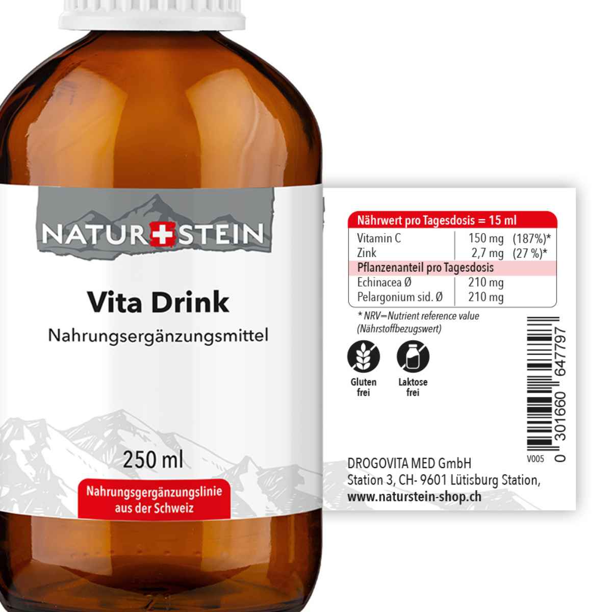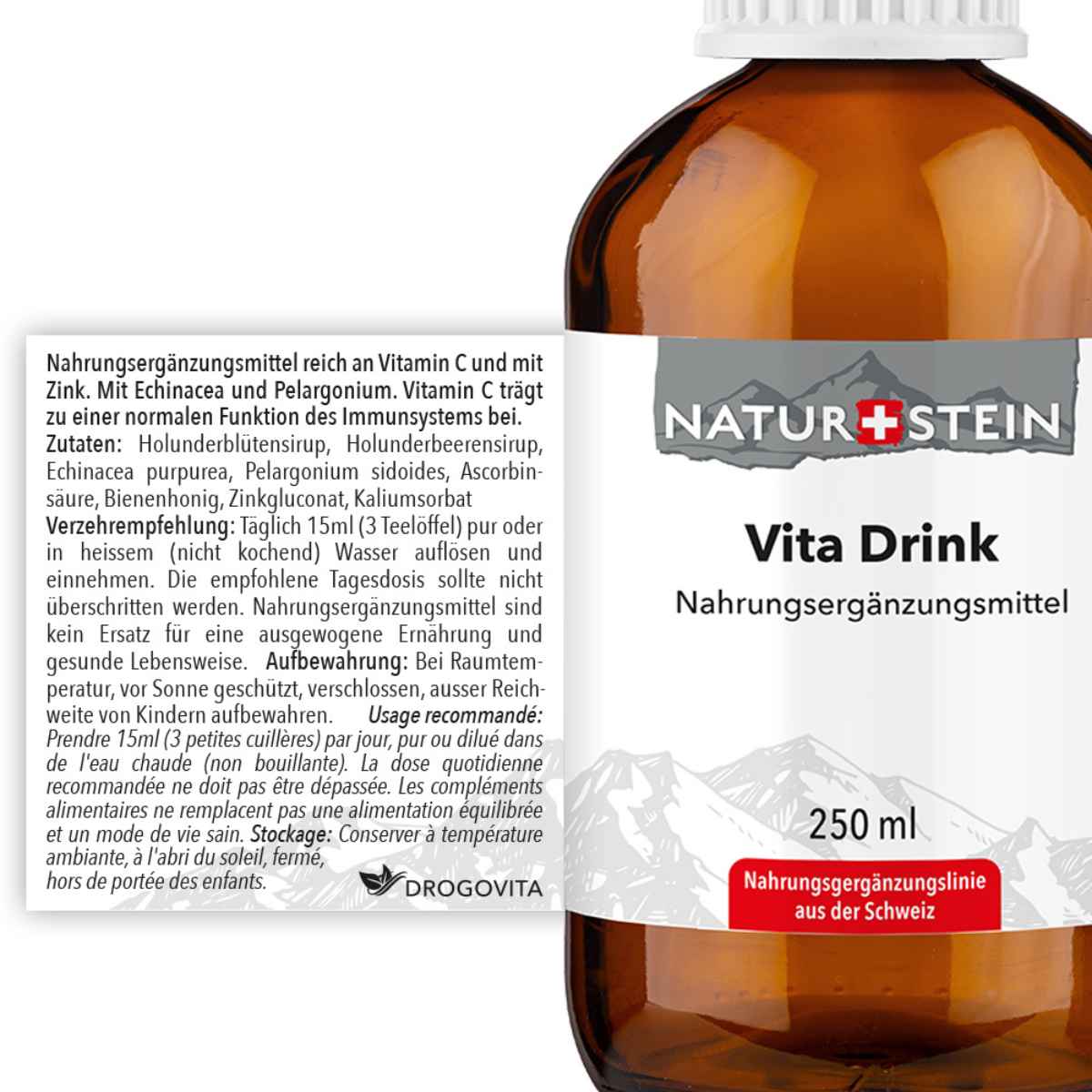 NATURSTEIN Vita Drink est un complément alimentaire liquide contenant de la vitamine C et du zinc ainsi que des ingrédients végétaux sélectionnés comme l'échinacée et le pélargonium. La recette est complétée par du sirop de fleurs et de baies de sureau et du miel.