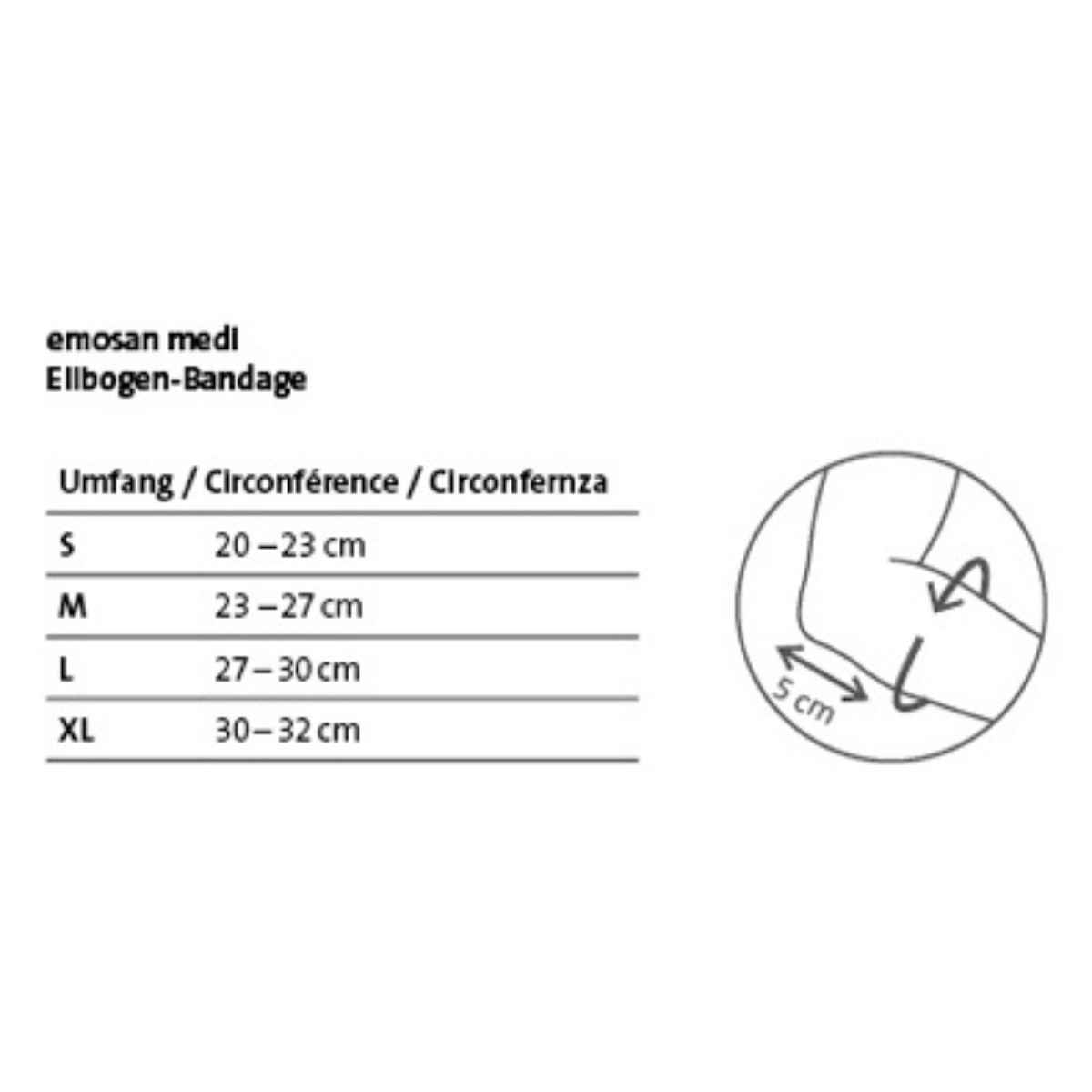 Bandages de coude Emosan medi en matériau hautement élastique à double traction pour un confort optimal. Zone du coude anatomiquement coudée. Tricot fin et confortable, facile à porter sous les vêtements.