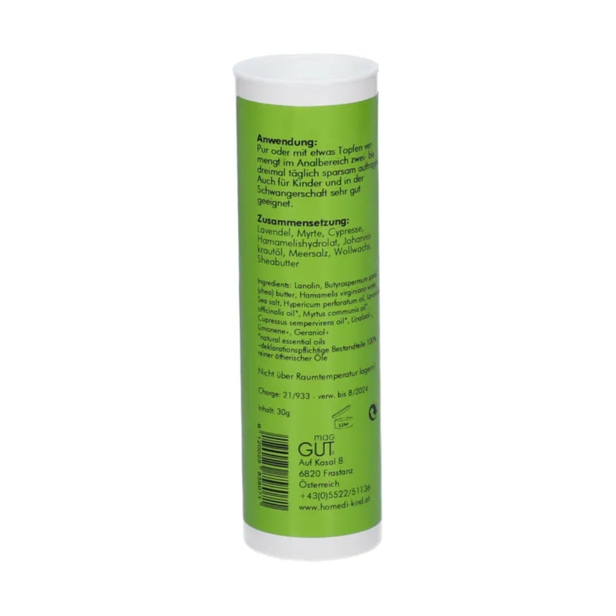 Les huiles végétales qu'elle contient apaisent la peau irritée de la région rectale (hémorroïdes) mais aussi les rhagades et les gerçures. Les huiles essentielles renforcent leurs propriétés, notamment lorsque la zone est surmenée.