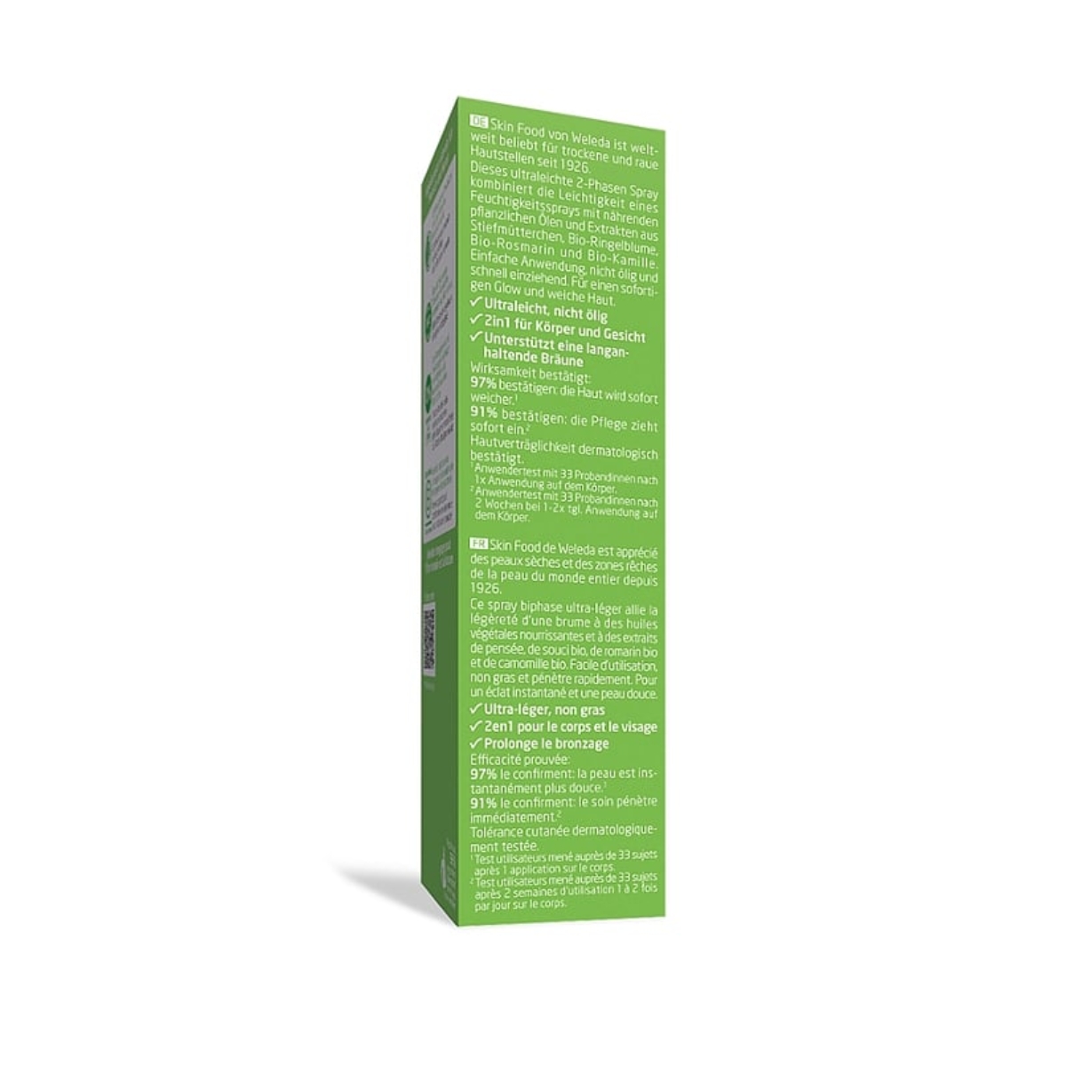 Bien agiter avant d'utiliser le spray biphasé. Vaporiser sur la paume des mains et appliquer sur le corps et le visage. L'huile sèche Skin Food Ulta-light peut être utilisée en complément de ta routine de soins du visage. Éviter le contour des yeux.