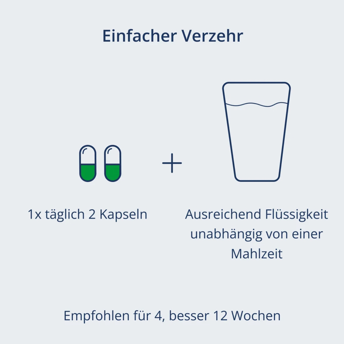 Pendant au moins quatre semaines, douze de préférence. Prendre deux gélules une fois par jour au cours d'un repas (matin, midi ou soir) sans les mâcher et avec suffisamment de liquide.