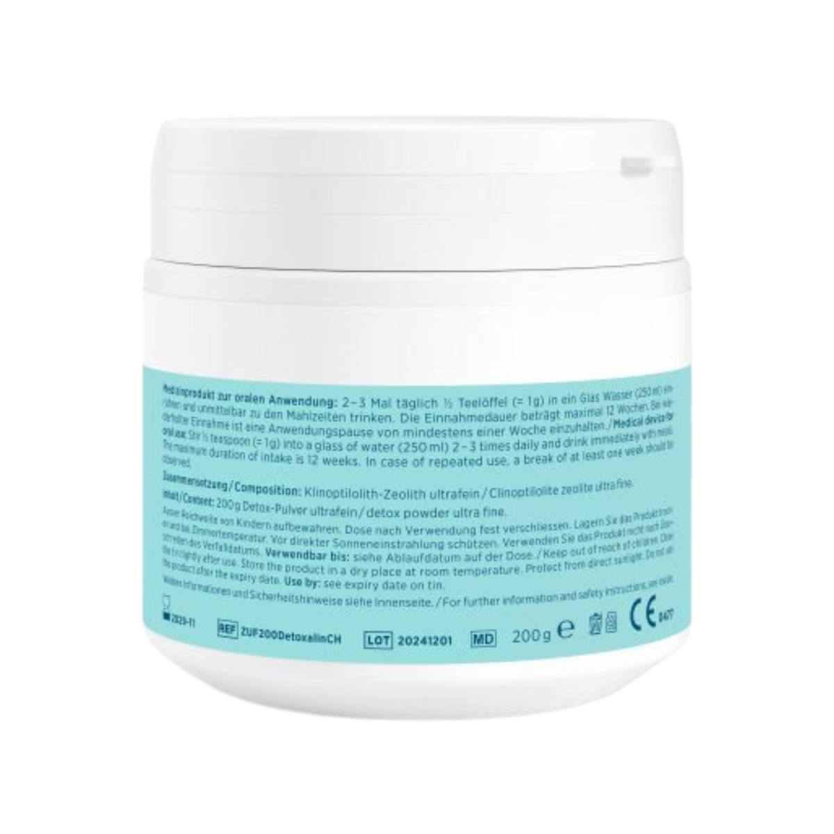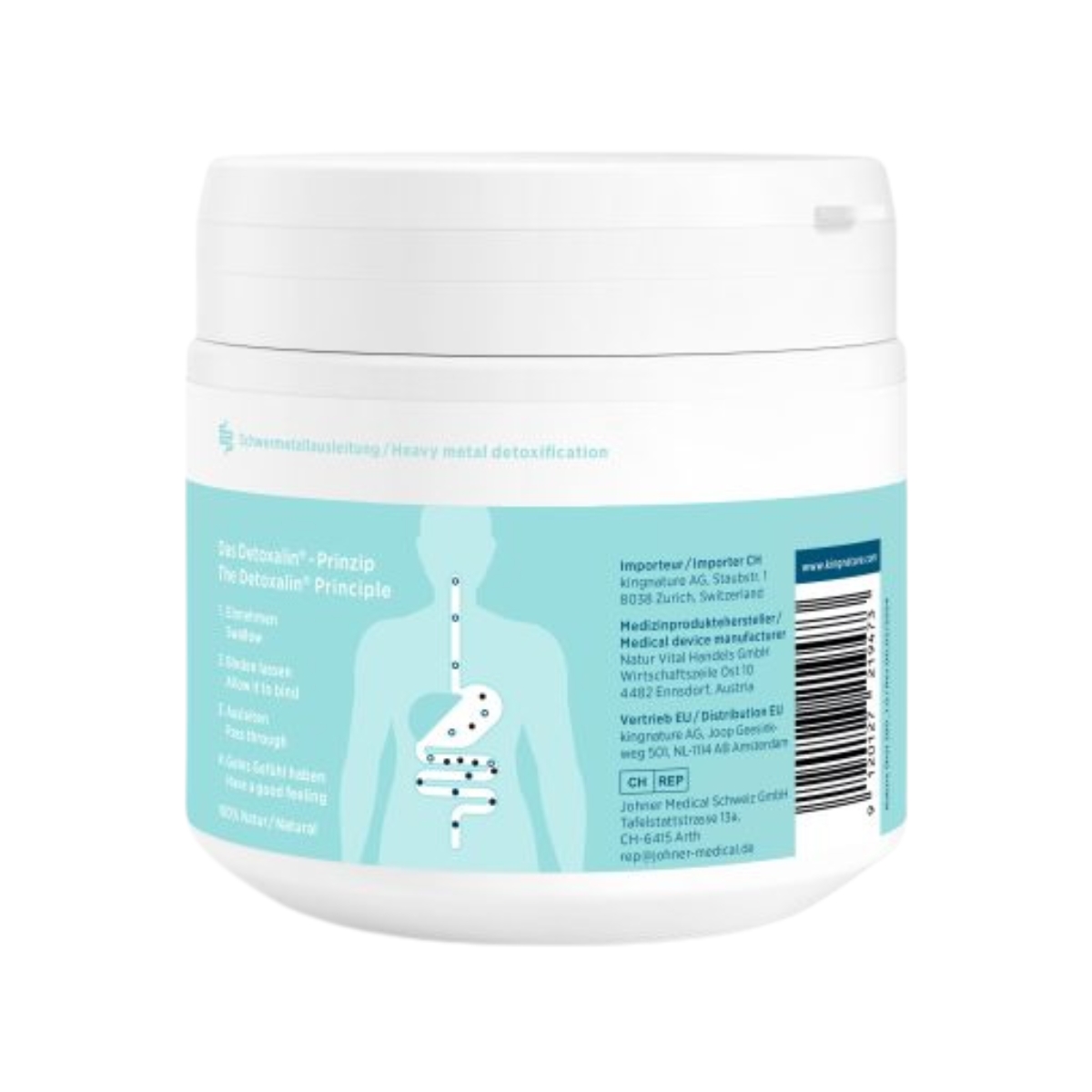 Detoxalin® lie les substances nocives et empêche que ces substances ne pénètrent dans notre organisme via l'intestin. Elle n'est pas absorbée par le corps, mais traverse le tube digestif comme une éponge. Elle est éliminée naturellement, non digérée, avec les substances nocives liées.
