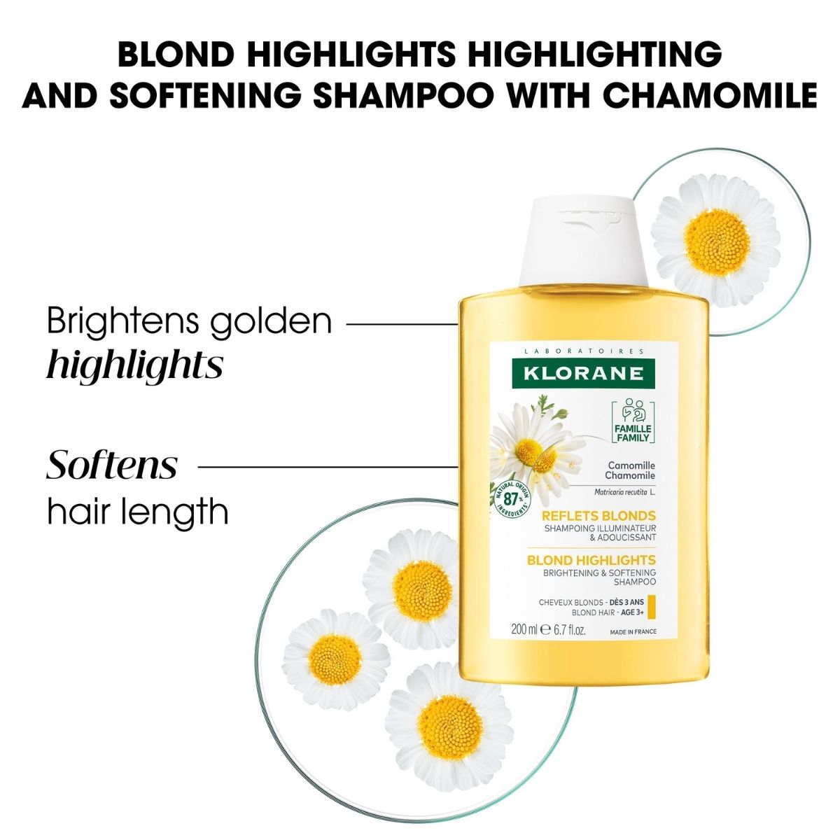 Sa formule haute tolérance avec 85% d'ingrédients d'origine naturelle et biodégradable convient à toute la famille à partir de 3 ans. La base lavante claire et légère nettoie les cheveux en douceur. La camomille est riche en pigments jaunes naturels et est traditionnellement utilisée pour éclaircir en douceur toutes les nuances de blond. Les cheveux sont subtilement éclaircis et prennent des reflets dorés pour des cheveux doux, propres et éclatants de beauté.