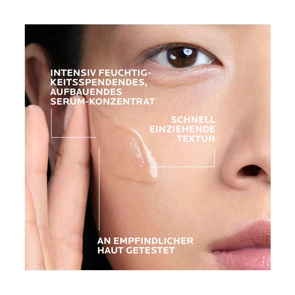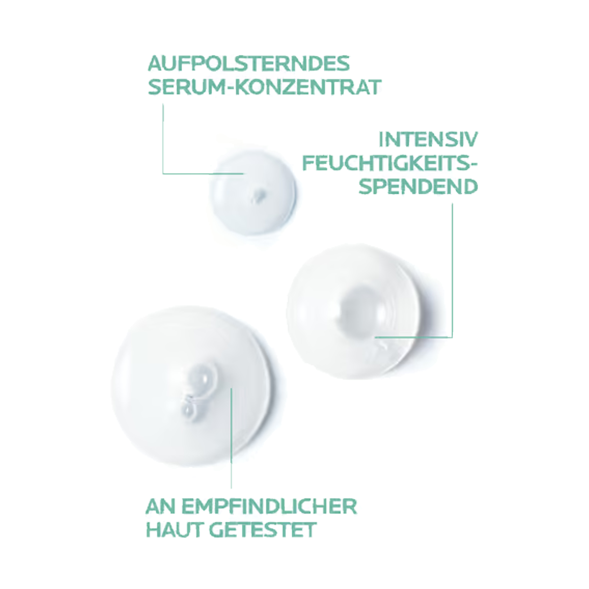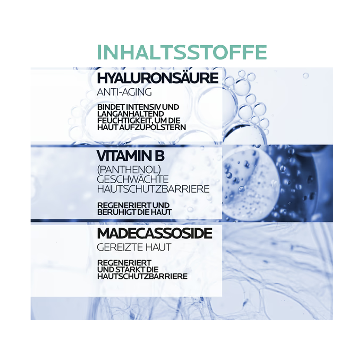 Le complexe de substances actives avec de l'acide hyaluronique hautement concentré, de la vitamine B5 nourrissante et des madécassosides protecteurs agit contre les signes de vieillissement naturel de la peau et protège la barrière cutanée des facteurs de vieillissement externes. Pour une peau immédiatement et visiblement plus jeune.