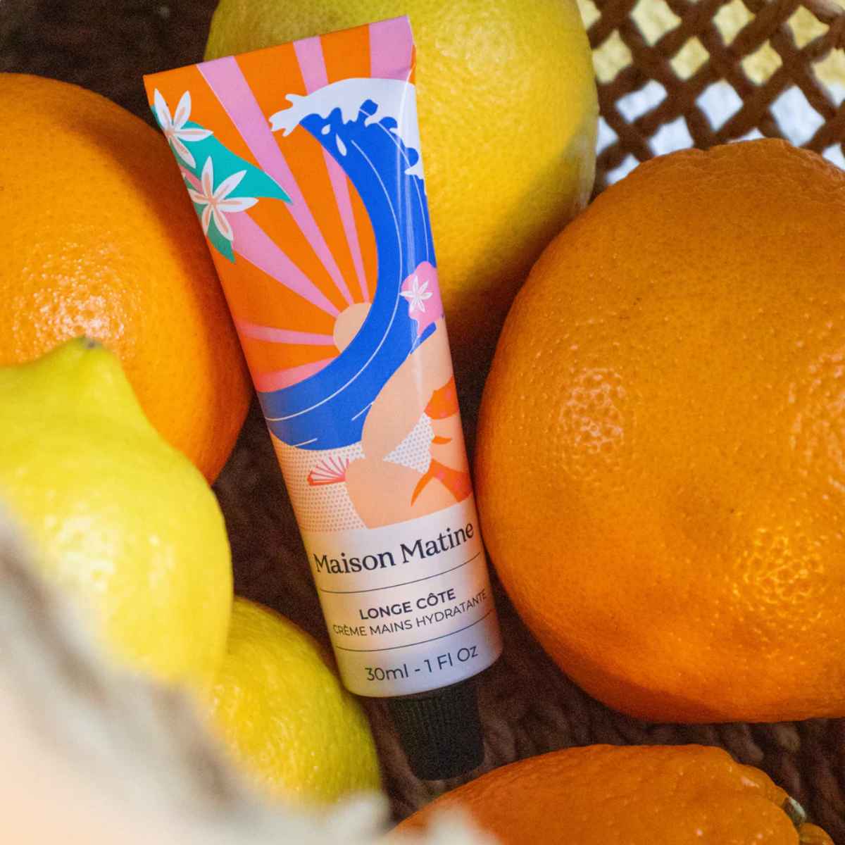 La crème pour les mains Longe Côte de Maison Matine nourrit intensément les mains et procure une sensation de douceur à la peau. Avec son parfum exotique et floral d'ylang-ylang, de noix de coco et de fleur de tiaré, elle te transporte dans des moments de bien-être estivaux.