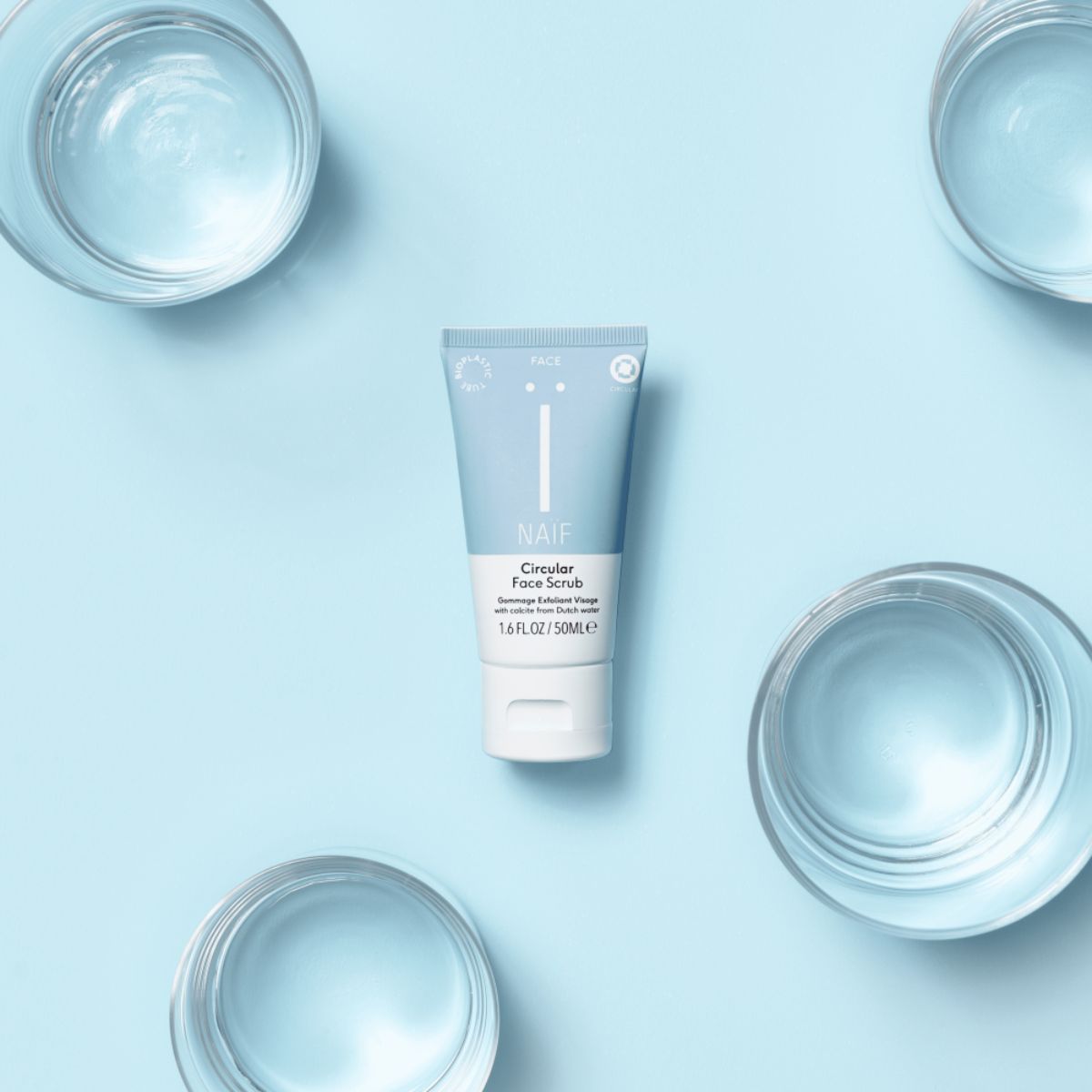 L'exfoliant doux pour le visage Naïf nettoie la peau et élimine les cellules mortes de la peau. Les fins grains exfoliants du gommage pour le visage sont 100 % recyclables. Les granules sont fabriqués à partir de chaux extraite de l'eau potable dans les Pays-Bas .