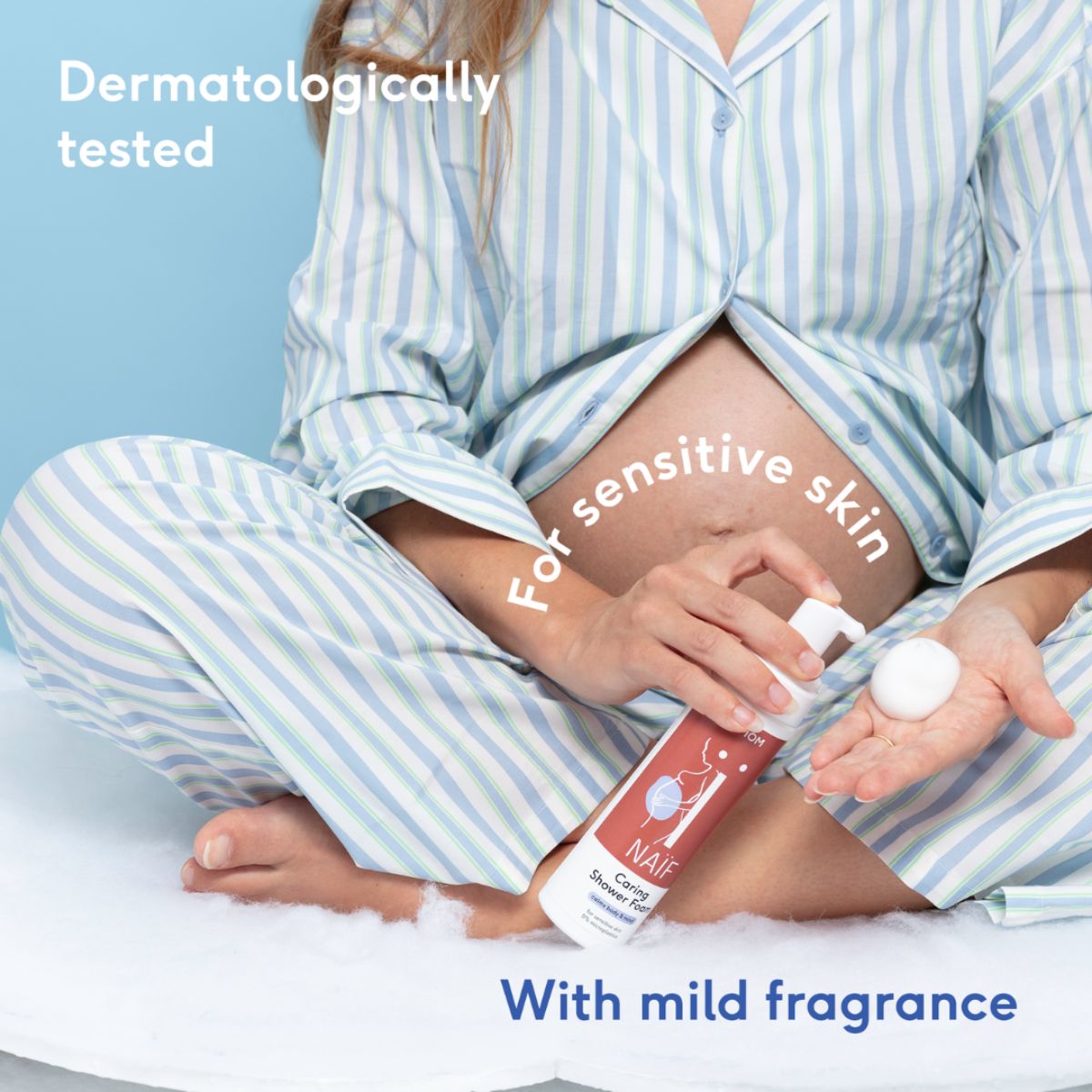 être enceinte : une fête pour certaines ; pour d'autres assez excitante et parfois difficile de se détendre. Prends un moment pour toi-même avec Naïf Nourishing Shower Foam. Cette mousse de douche crée une fine couche de mousse et laisse ta peau douce et fraîche. Avec le parfum chaud du jasmin et du bois de cèdre, ta douche se transforme en un moment de détente. Formulée pour la peau (sensible) des femmes enceintes, fabriquée à partir d'ingrédients obtenus naturellement et sans huiles essentielles. Avec de la glycérine, nettoie et hydrate ta peau en douceur. Prends soin de ton corps (changeant) avant, pendant et après la grossesse.