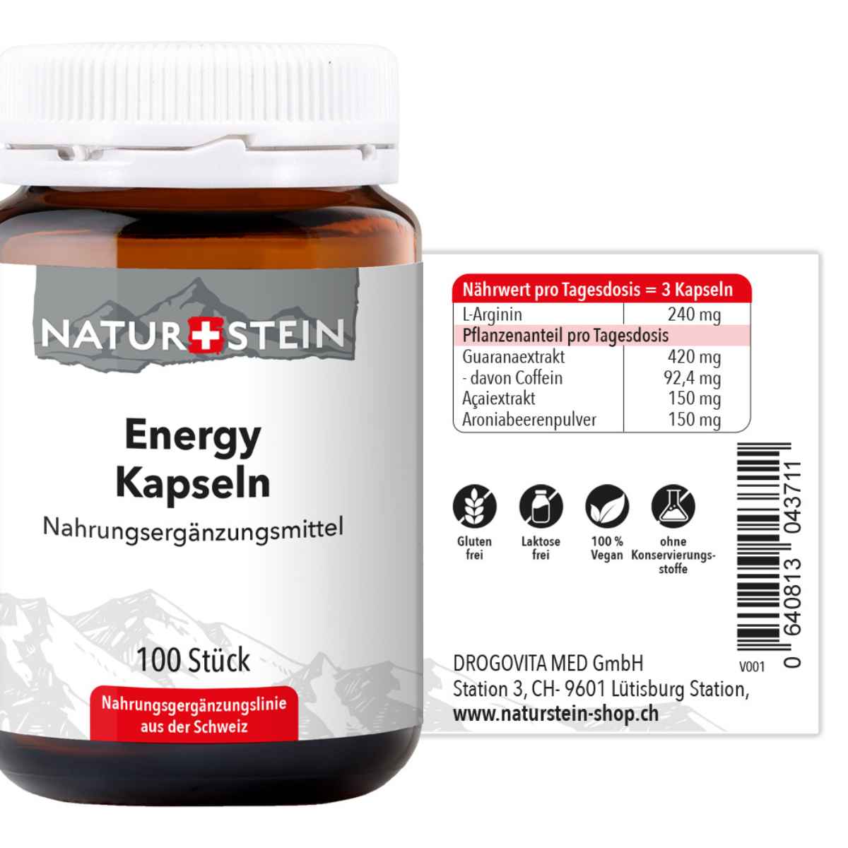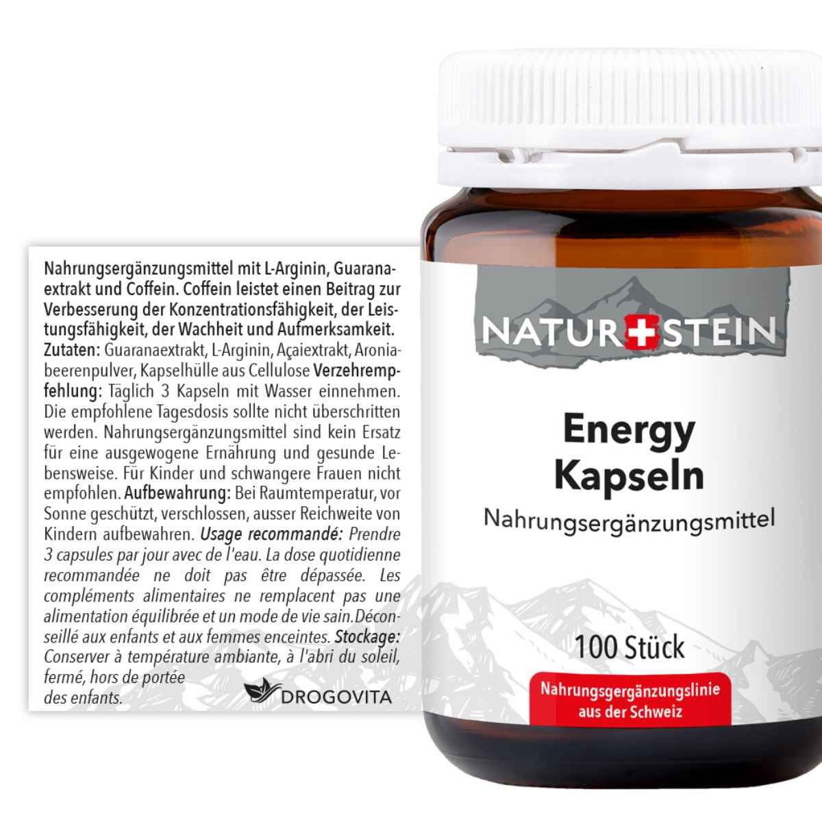Les gélules NATURSTEIN Energy sont un complément alimentaire contenant de l'extrait de guarana comme source naturelle de caféine, de la L-arginine et des extraits végétaux d'açaí et de baies d'aronia. Les gélules conviennent pour compléter une alimentation équilibrée.