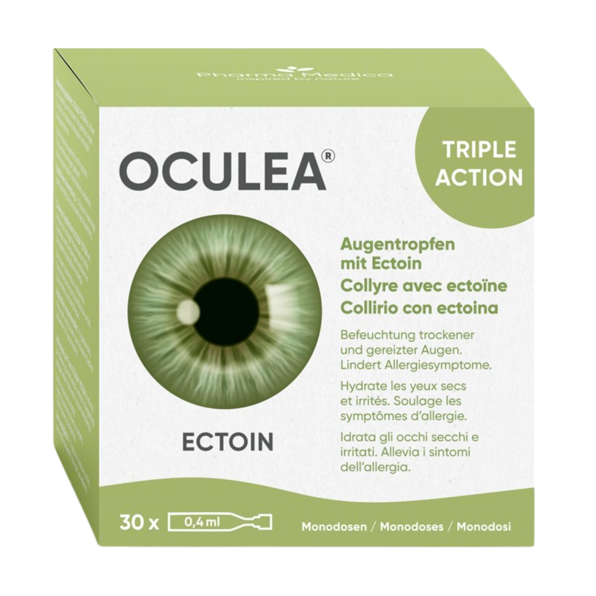 Les gouttes oculaires Oculea Ectoin soulagent les symptômes d'allergie tels que les démangeaisons et les brûlures des yeux.