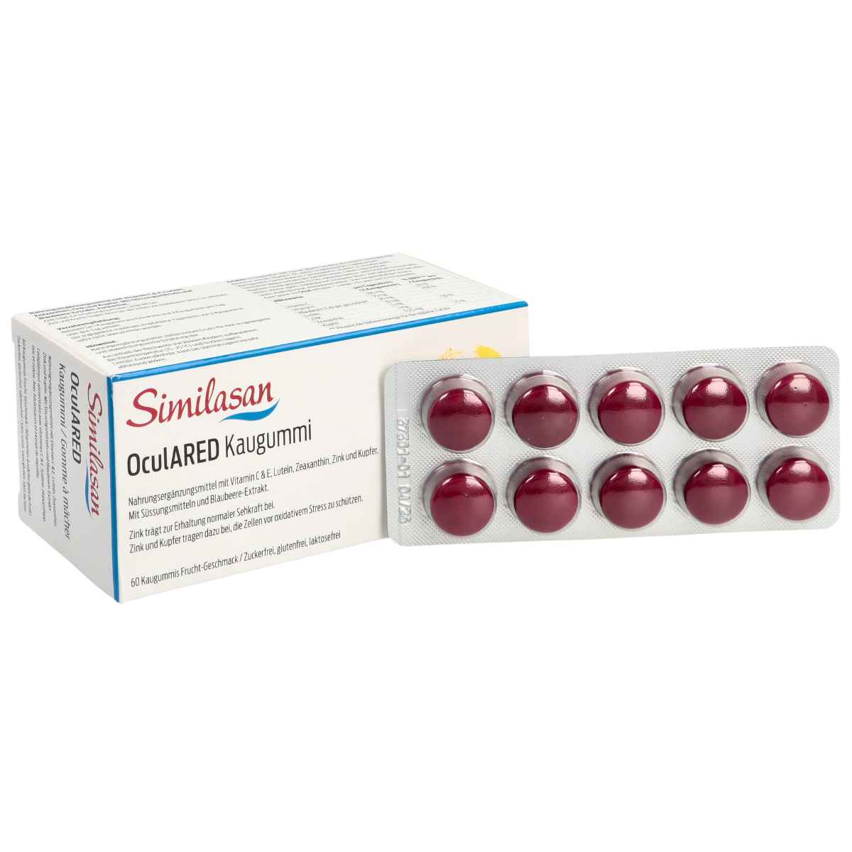 Similasan OculARED chewing-gum est un complément alimentaire contenant des vitamines C & E, de la lutéine, de la zéaxanthine, du zinc et du cuivre.