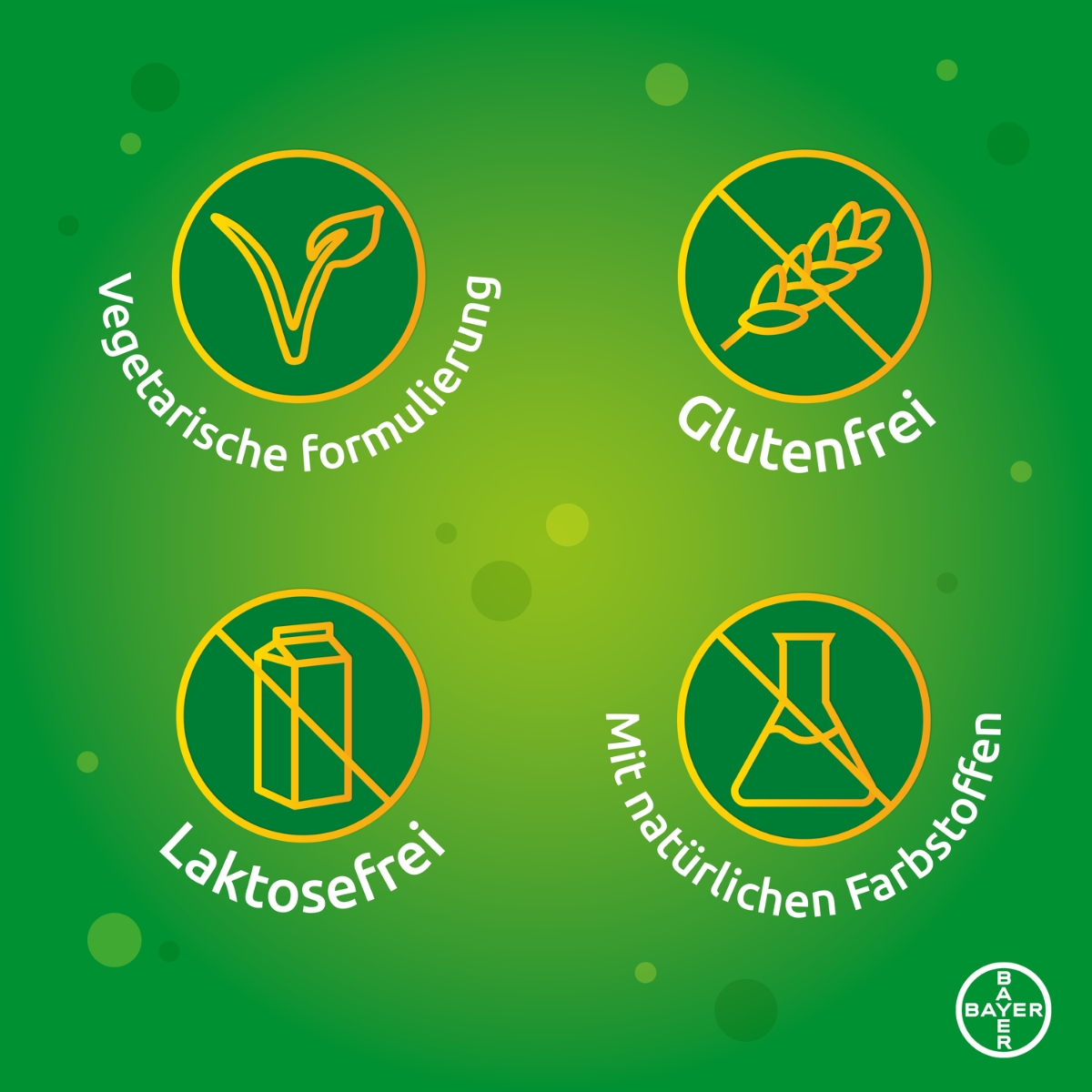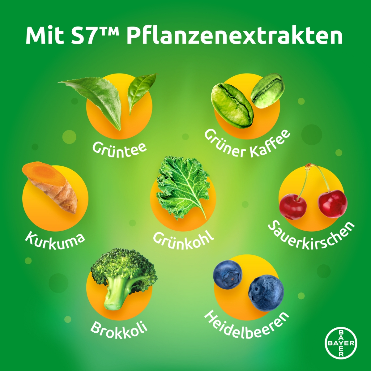 Füllstoff (Cellulose), Calcium, Vitamin C, Magnesium, Niacin, Überzugsmittel (Hydroxyproplmethylcellulose, Fettsäuren), Eisen, Maltodextrin, Pflanzenextrakt (grüner Kaffee, Grüntee, Kurkuma (Tetrahydrocurcuminiode), Heidelbeere, Brokkoli, Sauerkirsche, Grünkohl), Zink, Pantothensäure, Vitamin B12, B6, B2, B1, D, Kupfer, Folsäure, Biotin, Selen, Trennmittel (Magnesiumsalze der Speisefettsäuren), Farbstoff (Nahrungskonzentrat [Distel, Spirulina])