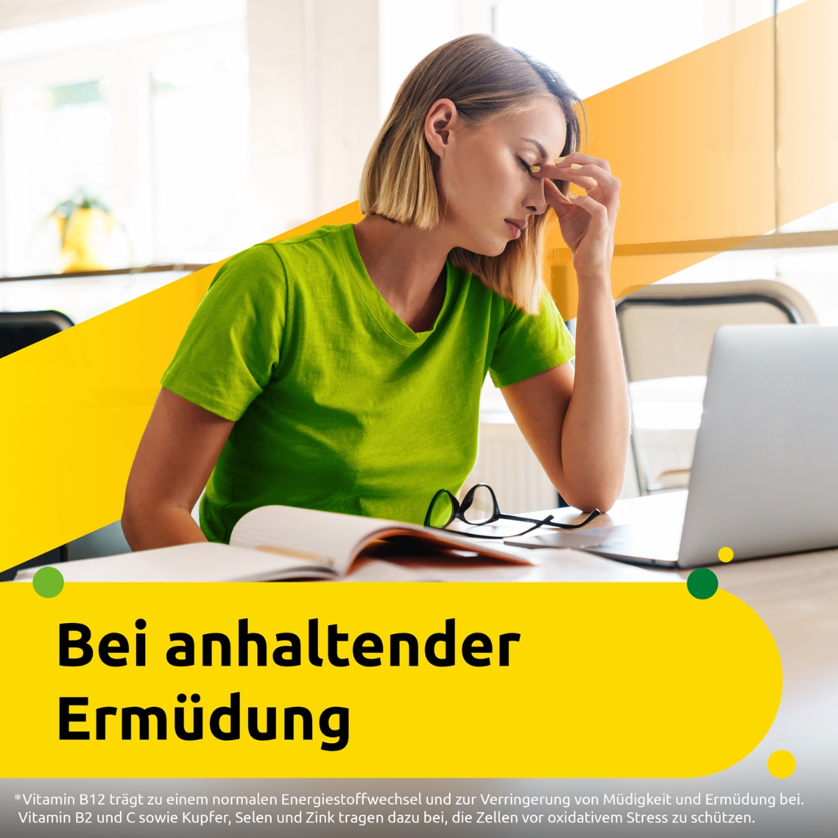La vitamine B12 contribue à un métabolisme énergétique normal et à la réduction de la fatigue et de l'épuisement. Les vitamines B2 et C ainsi que le cuivre, le sélénium et le zinc contribuent à protéger les cellules contre le stress oxydatif.