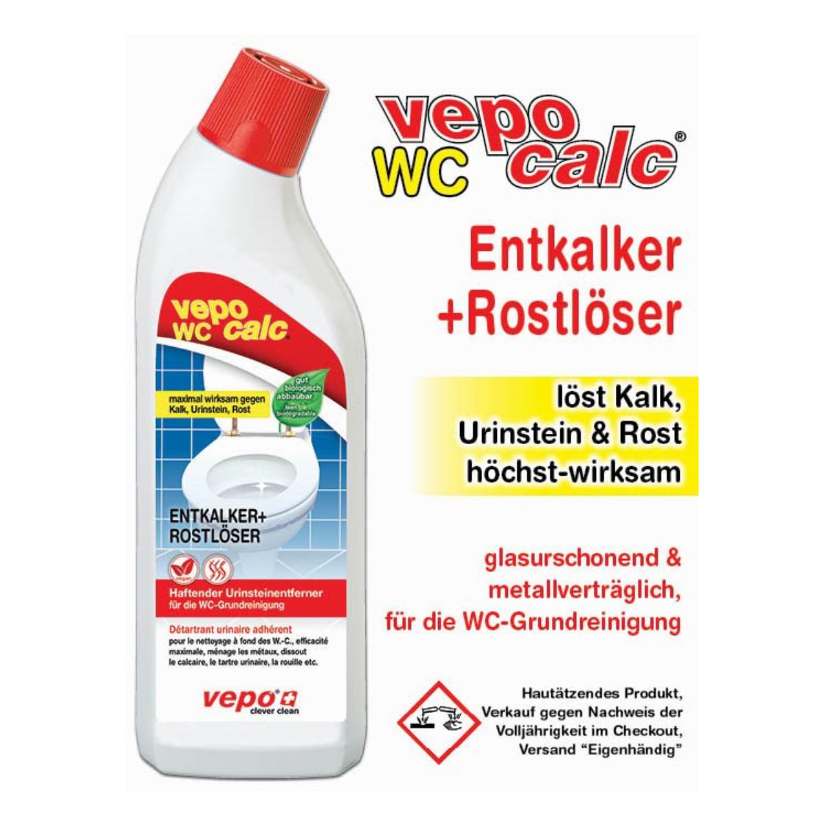 Le Vepocalc WC détartrant + dissolvant de rouille est un nettoyant sanitaire très efficace, spécialement conçu pour éliminer le calcaire, le tartre urinaire et les dépôts de couleur rouille dans les cuvettes de WC. Il agit de manière adhérente, élimine les dépôts même sous le rebord des WC tout en respectant la vitrocéramique et en étant compatible avec les métaux.