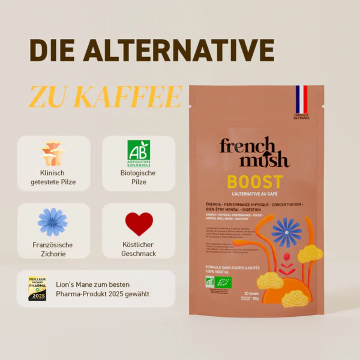 Boost Chicorée richtet sich an diejenigen, die eine sanftere, bekömmlichere und stabilere Alternative zu Kaffee im Alltag suchen. Ein Getränk auf Basis von biologischen Pilze.