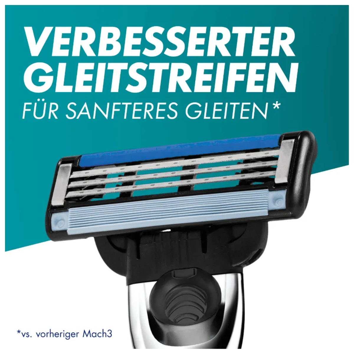 Der integrierte Gleitstreifen mit pflegenden Inhaltsstoffen sorgt für ein besonders sanftes Gleiten der Klinge – und das bei jeder Rasur. Die Turbo-Klingen sind langlebiger und bleiben länger scharf als klassische Mach3-Klingen.