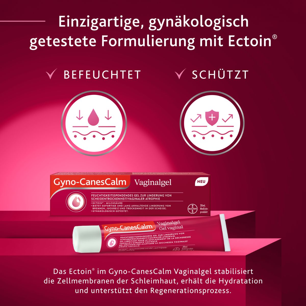 Das Ectoin® im Gyno-CanesCalm Vaginalgel stabilisiert die Zellmembranen der Schleimhaut, erhält die Hydratation und unterstützt den Regenerationsprozess. Ectoin® bindet Wasser und bildet den Ectoin®-Hydrokomplex. Gyno-CanesCalm befeuchtet die trockene Vaginalschleimhaut sofort (nach 10–15 Minuten) und reduziert die Symptome langanhaltend (bis zu 5 Tage).