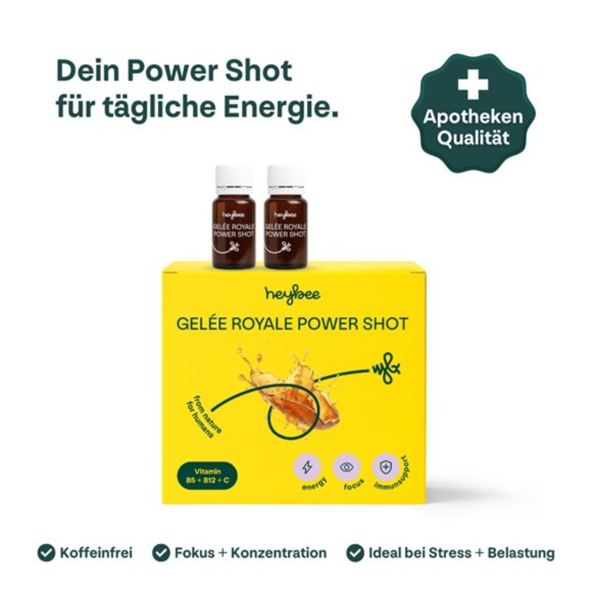 Der heybee Gelée Royale Power Shot ist ein praktisches Nahrungsergänzungsmittel in Trinkampullen, das natürliche Bienenprodukte, Vitamine und Pflanzenextrakte kombiniert. Die spezielle Formel enthält Gelée Royale, Honig, Acerola, Sanddorn sowie Vitamin B5 und Vitamin B12 und wurde entwickelt, um Energie, Konzentration und geistige Leistungsfähigkeit im Alltag zu unterstützen – ganz ohne Koffein.