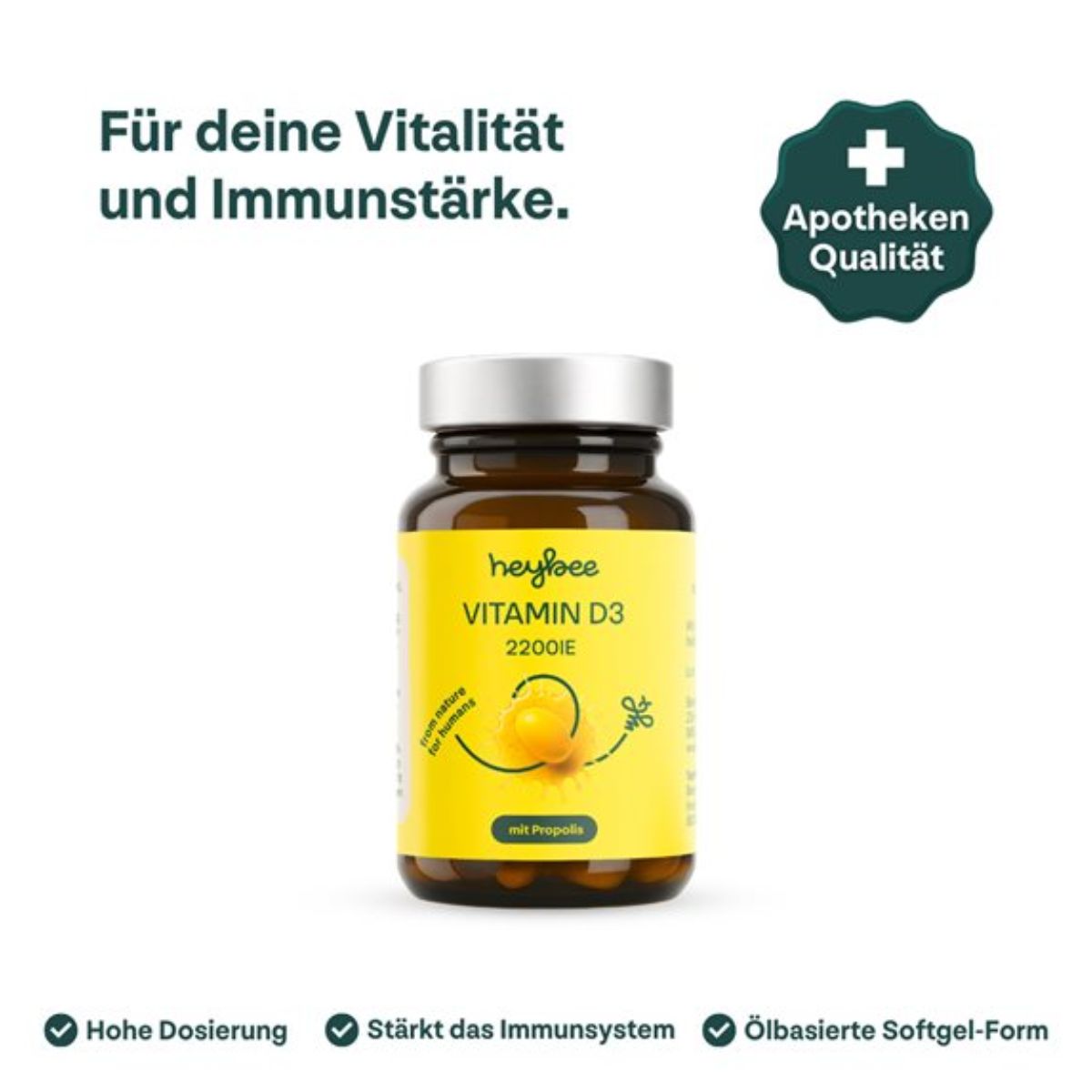 Die heybee Vitamin D3 2200 IE + Propolis Kapseln kombinieren hochdosiertes Vitamin D3 mit Propolis-Trockenextrakt in einer praktischen Kapselform. Die durchdachte Rezeptur auf Basis von nativem Olivenöl extra ermöglicht eine einfache Integration in die tägliche Routine.