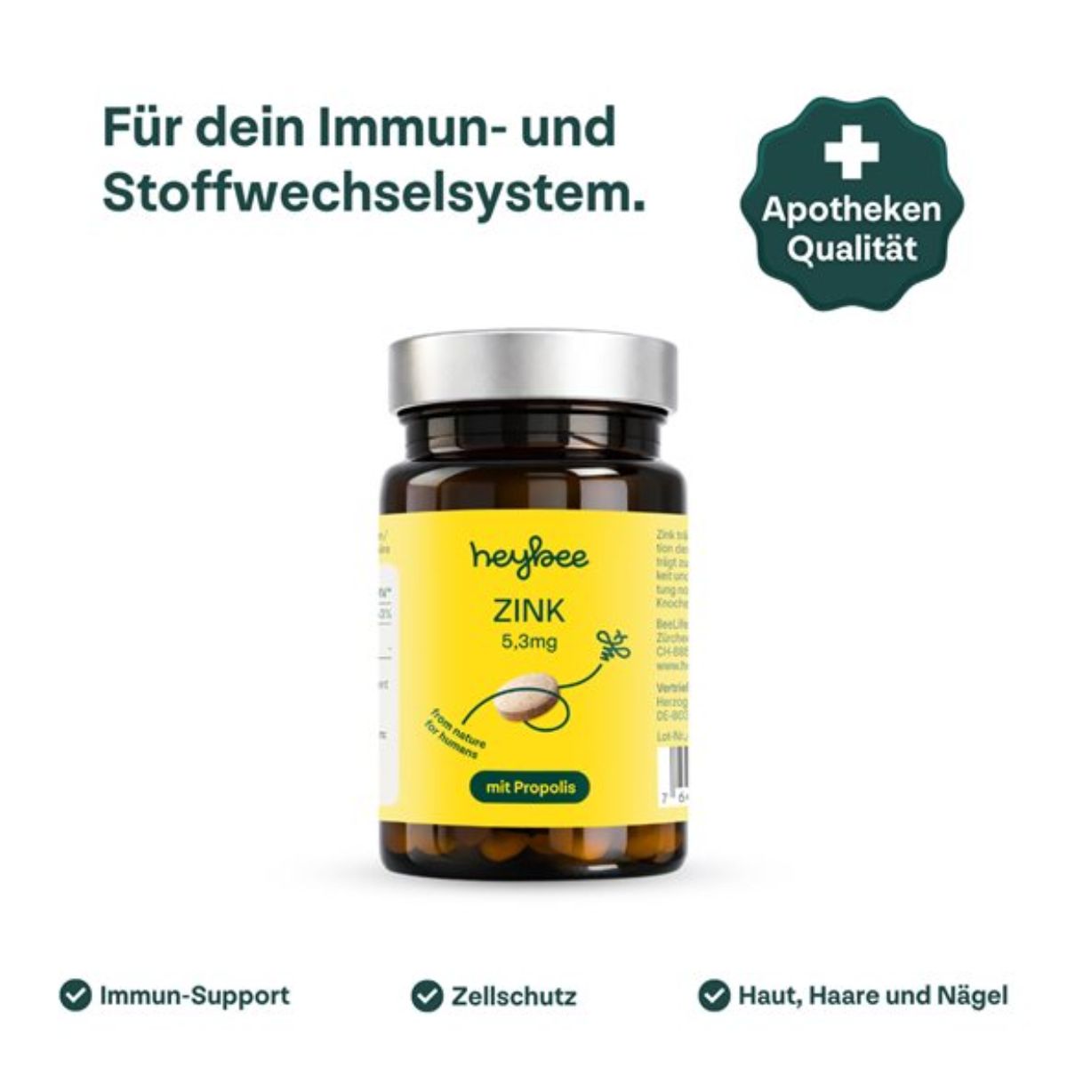 Die Heybee Zink 5,3 mg + Propolis Tabletten kombinieren hochwertiges Zinkbisglycinat mit Propolis-Trockenextrakt in praktischer Tablettenform. Die sorgfältig abgestimmte Rezeptur ermöglicht eine einfache und unkomplizierte Integration in den Alltag.
