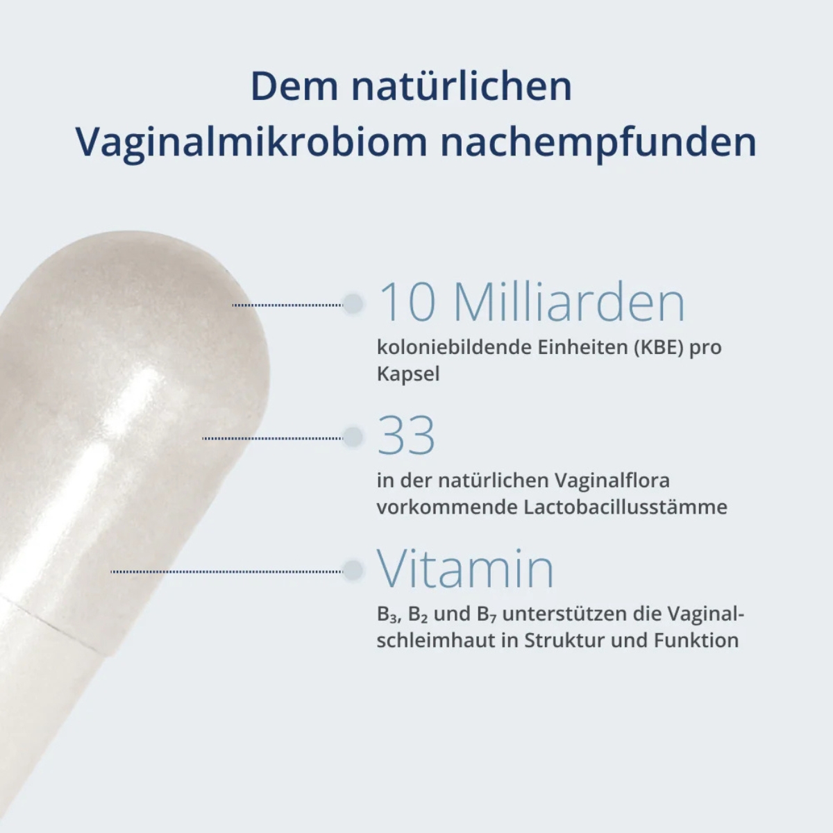- Unterstützt die Vaginalschleimhaut in Struktur und Funktion (Vitamin B3, B2 und B7)