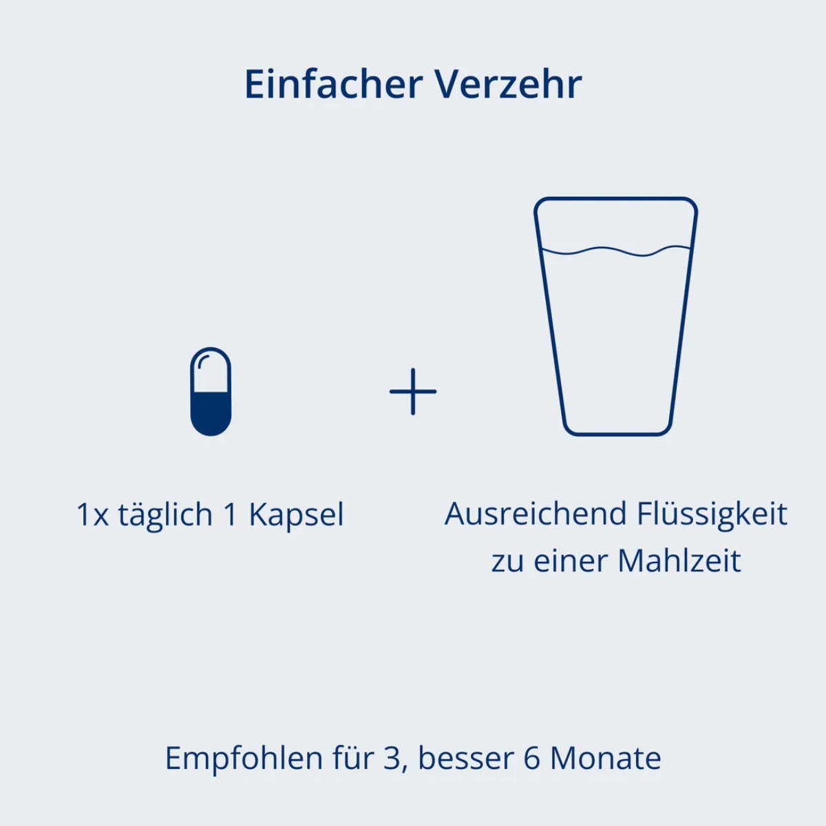 Während mindestens 4 Wochen täglich 1 Kapsel mit ausreichend Flüssigkeit zu einer Mahlzeit einnehmen.